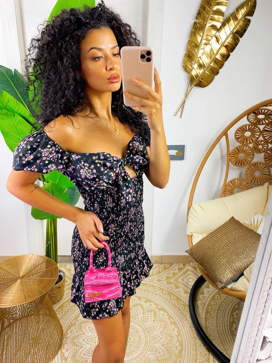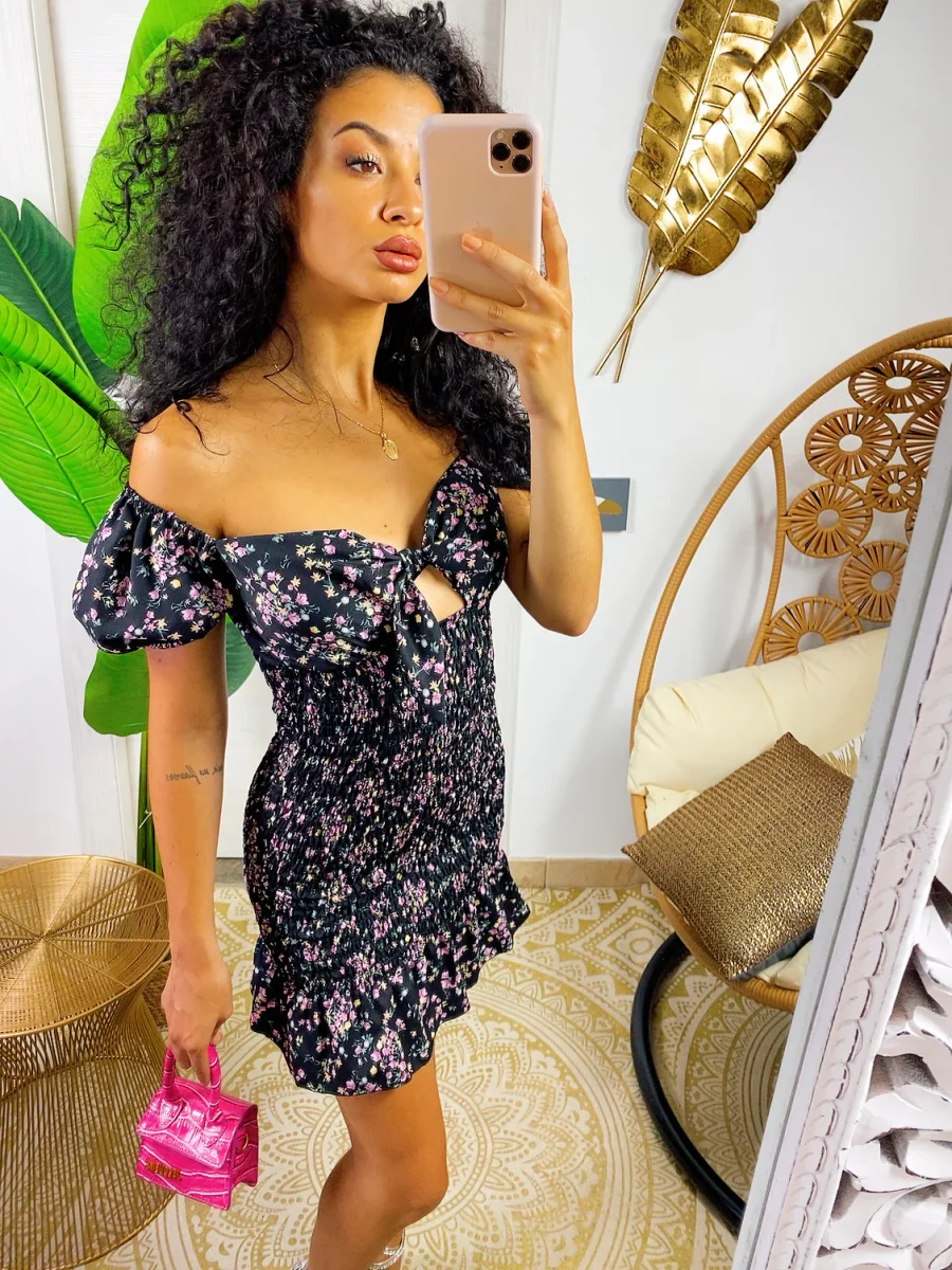 Tubino aderentemente a fiori Nero. Tessuto completamente elasticizzato con una balza finale. Manichina a sbuffo. Modello corto