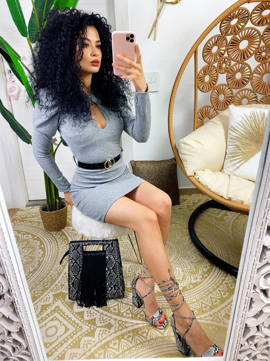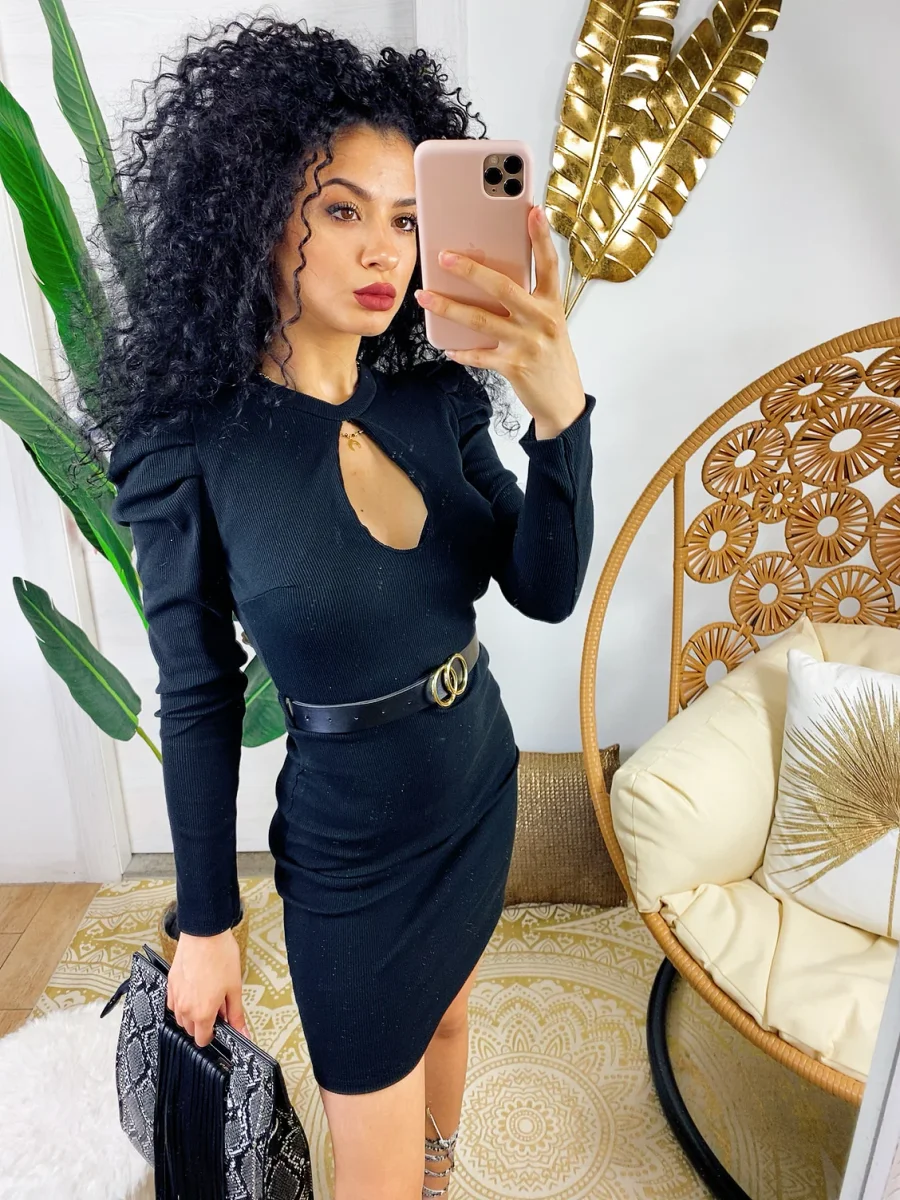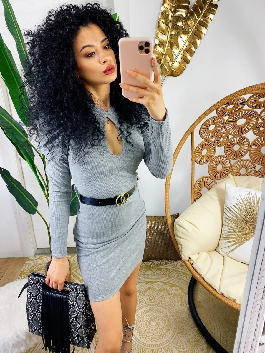 Abito in cotone a costine con maniche lunghe e scollo sul davanti. Cintura inclusa nell’abito.