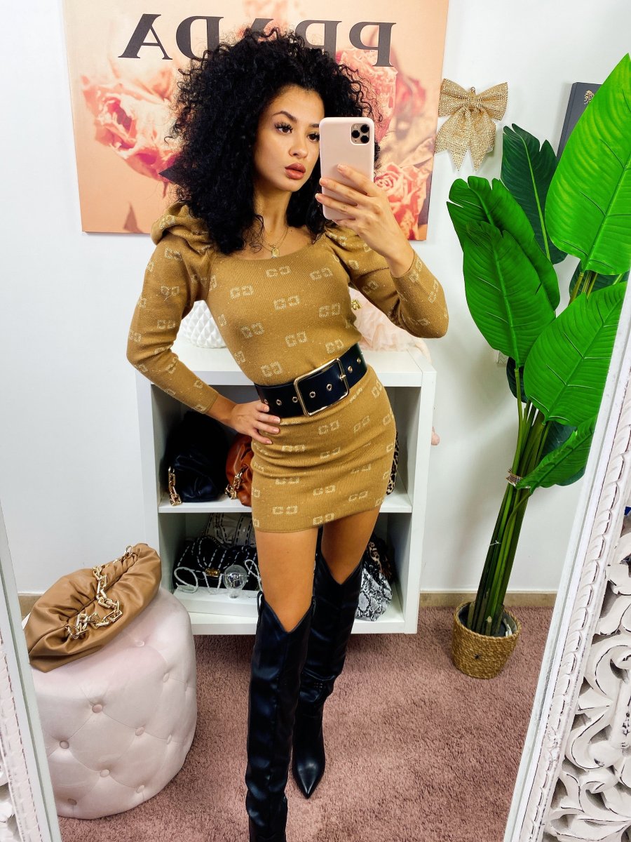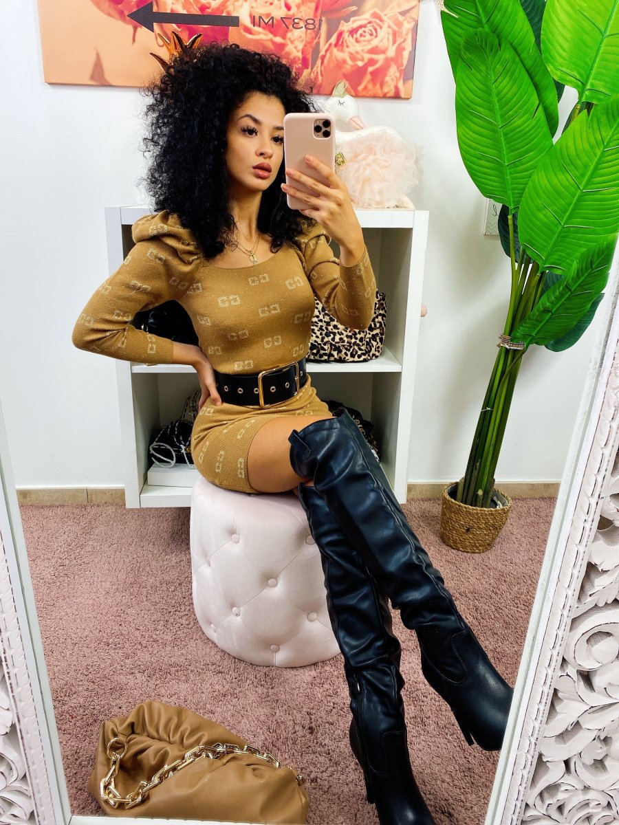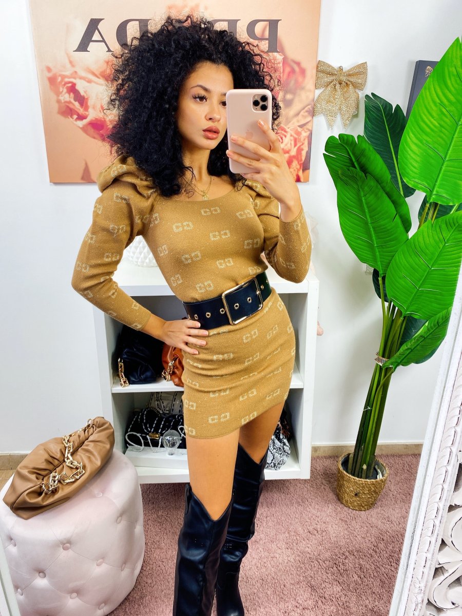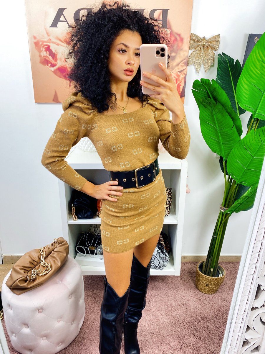 Tubino aderente con maniche bombate. Tessuto elasticizzato comodo. Stampa a scritte gold