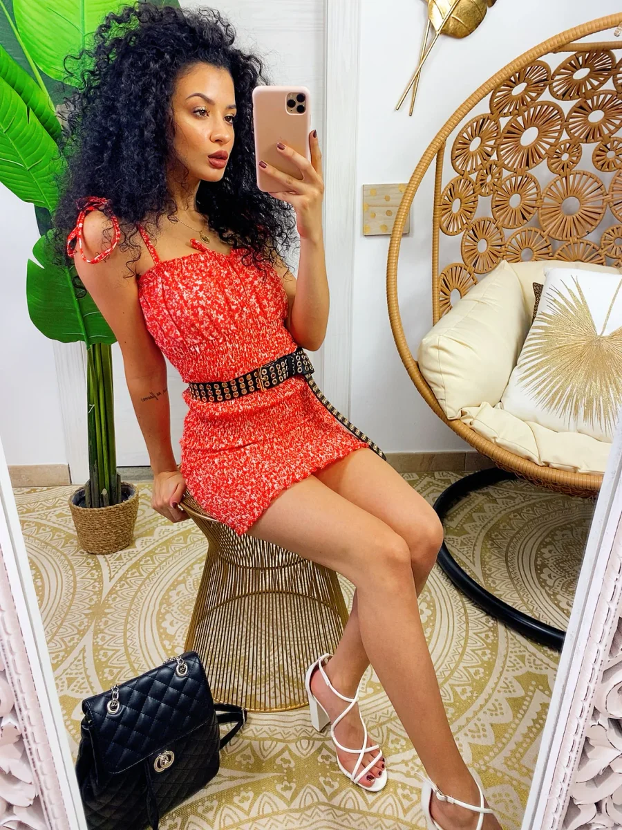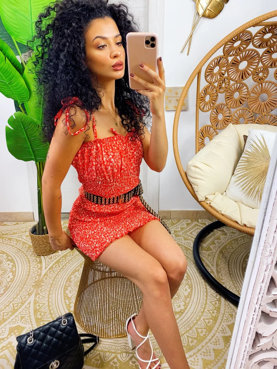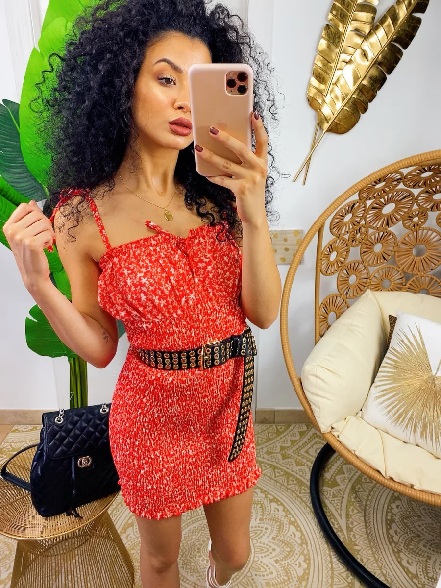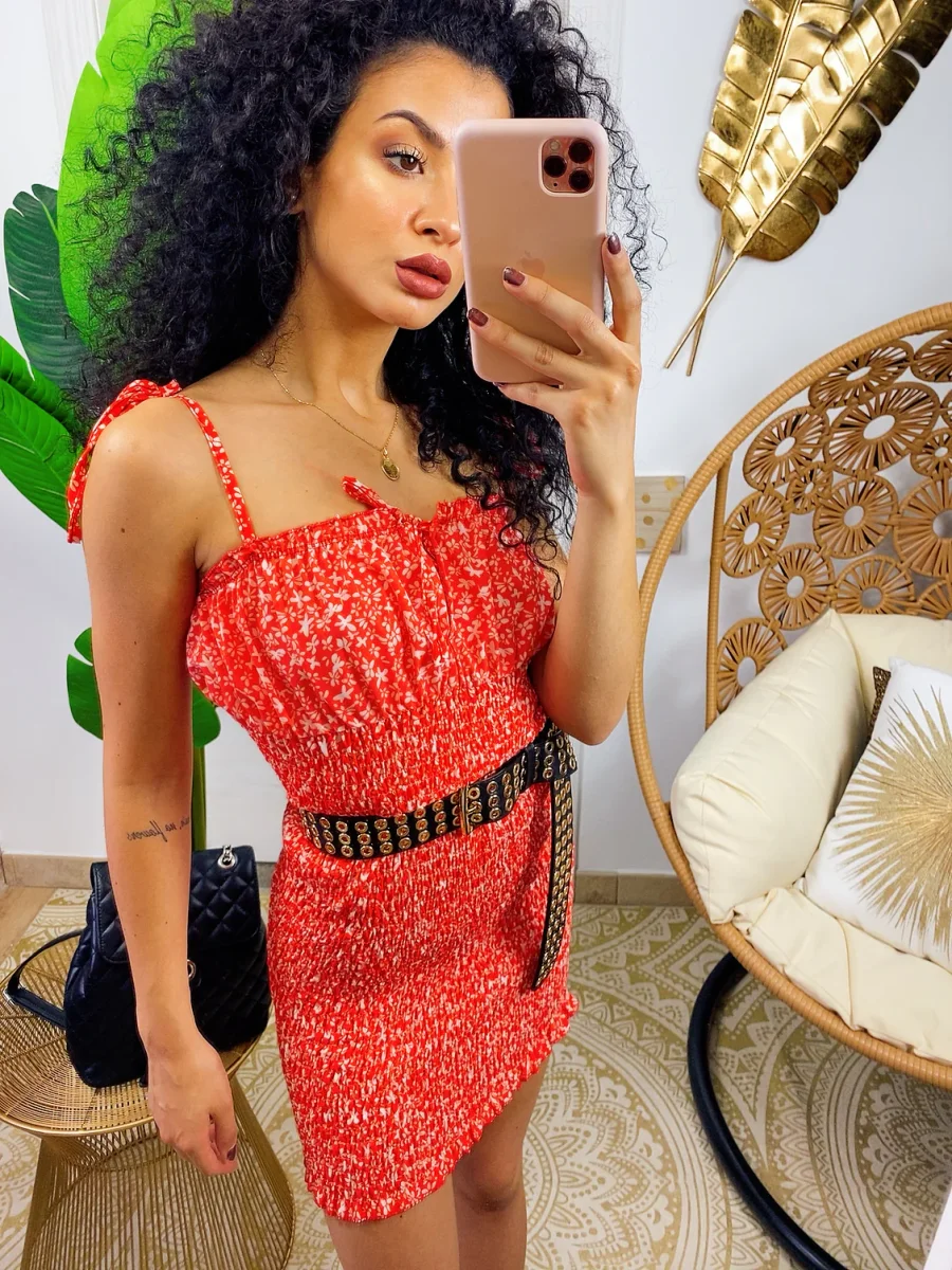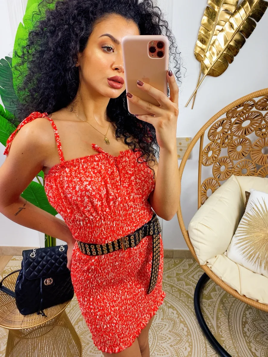 Tubino aderentemente a fiori rossi. Tessuto completamente elasticizzato.