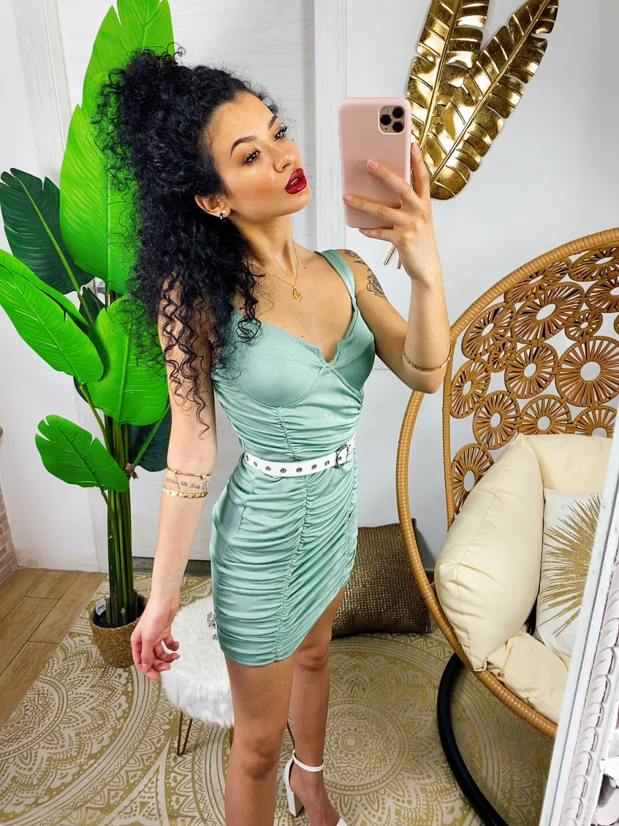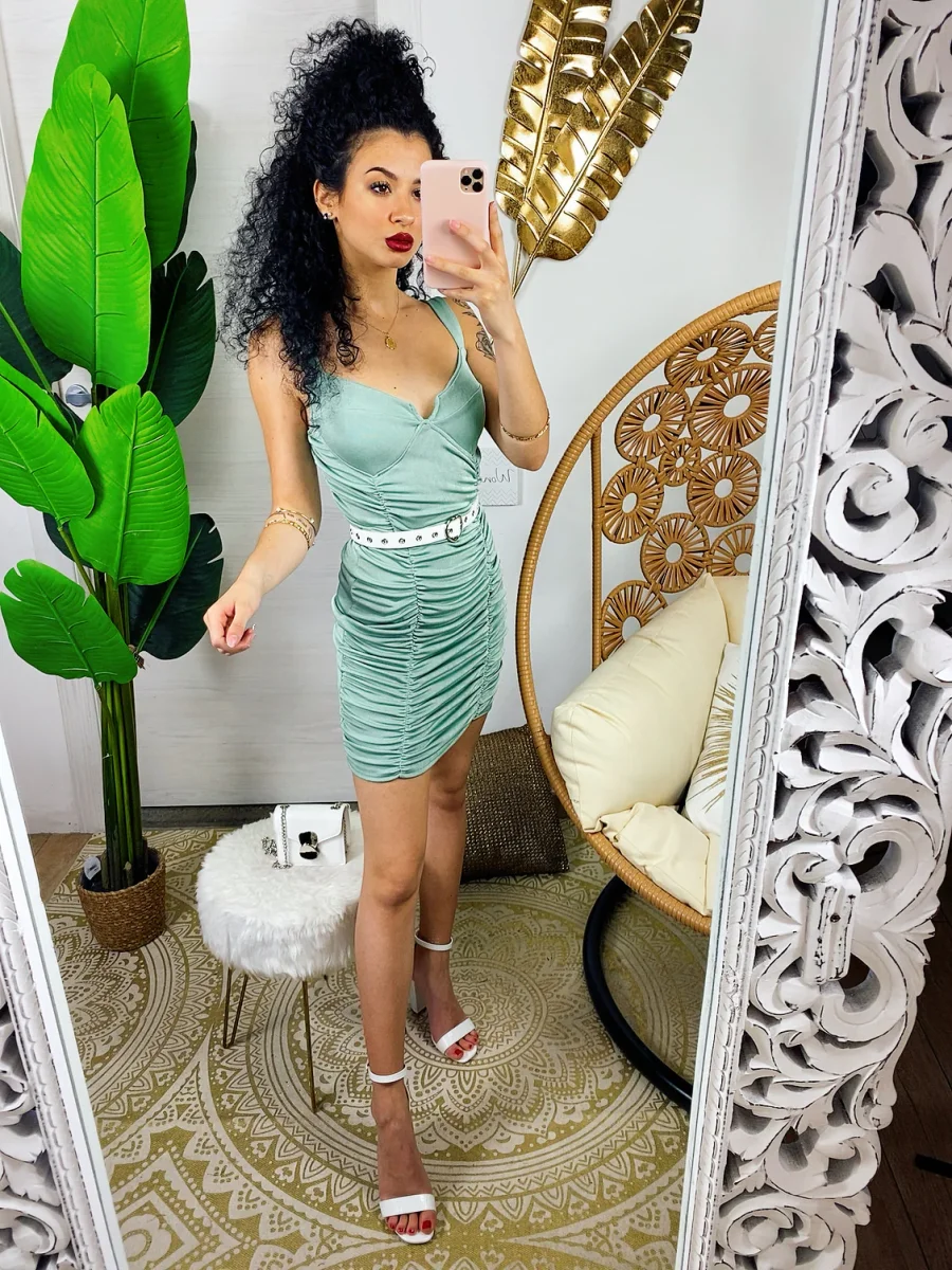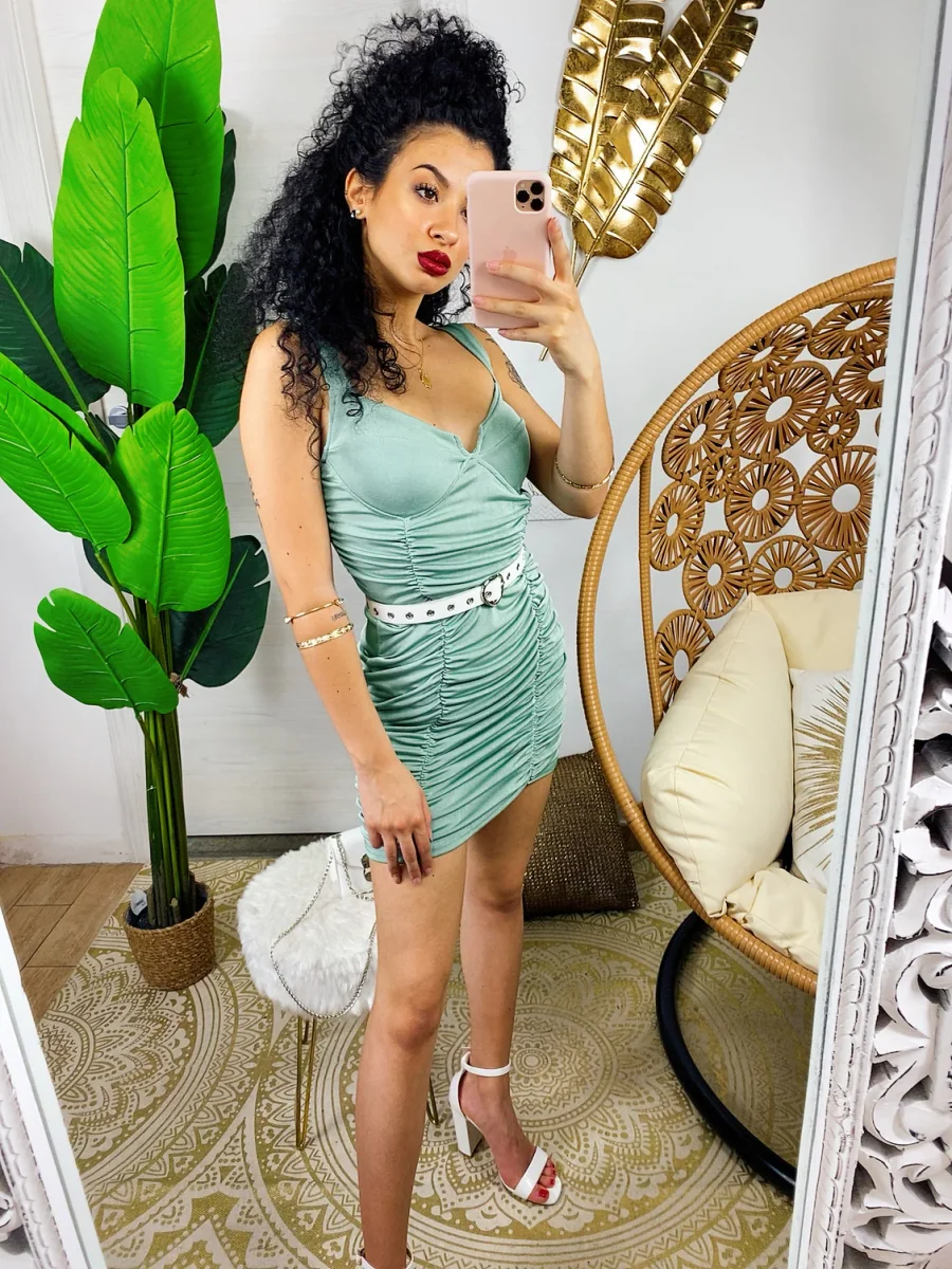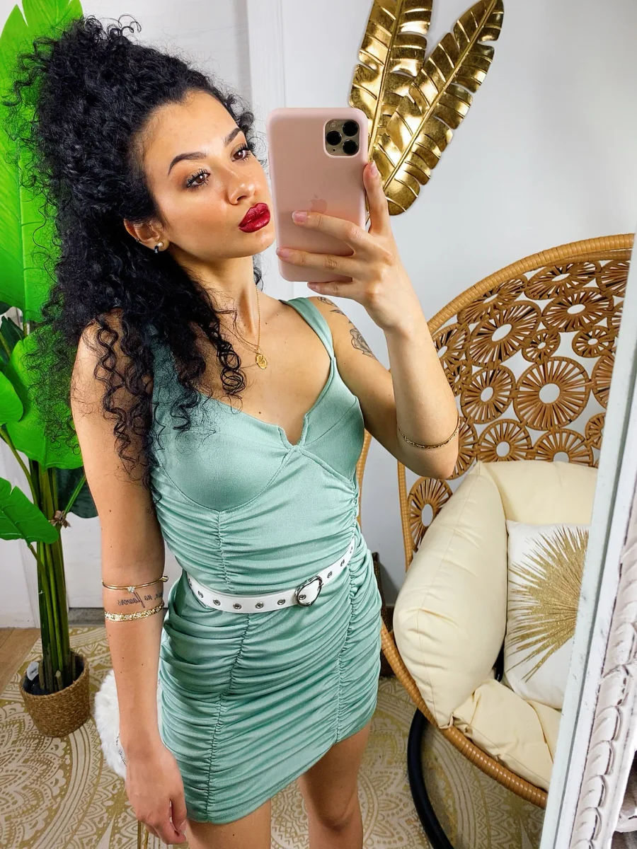 Abito in tessuto leggero arricciato. Molto aderente e dotato di coppe.