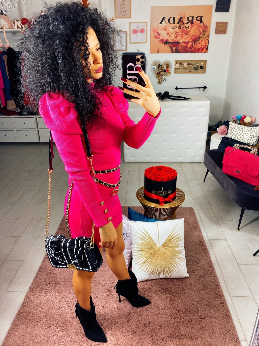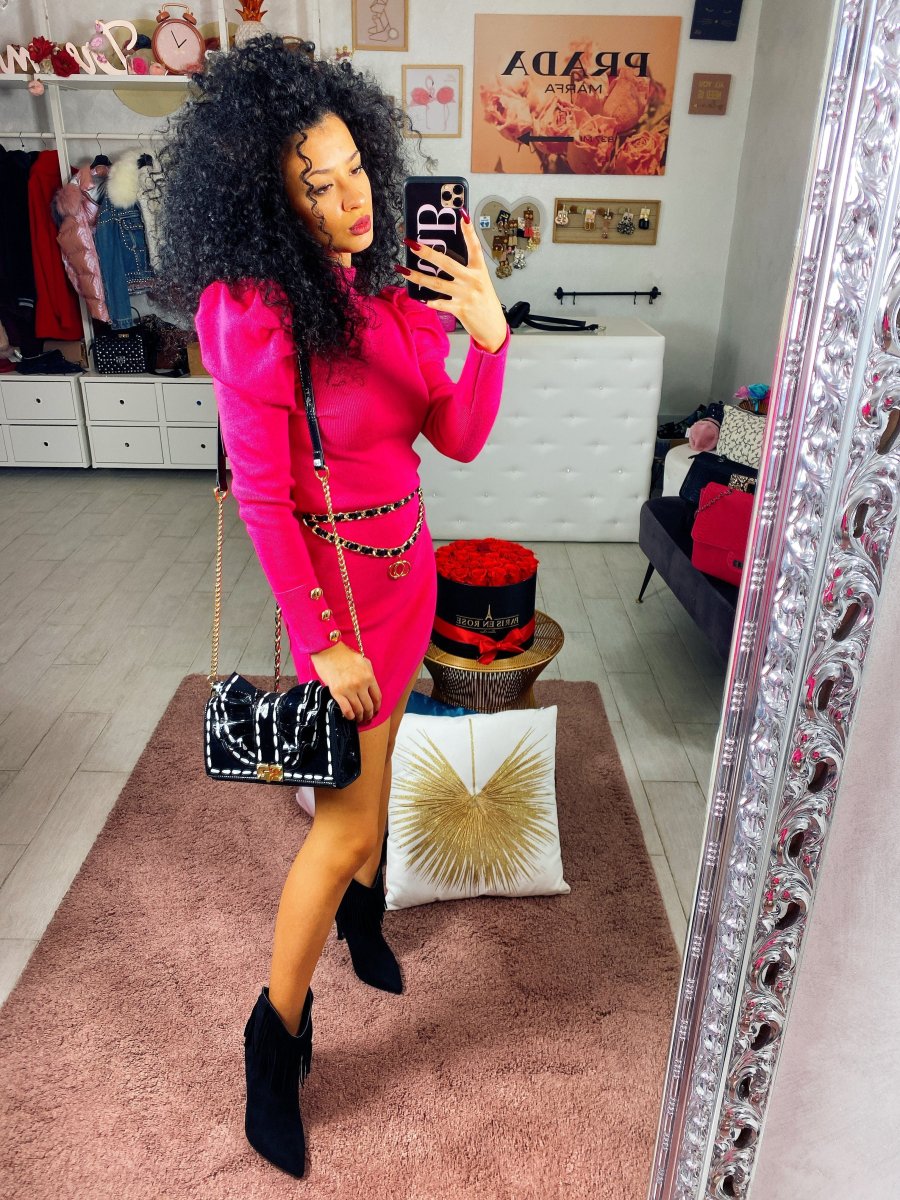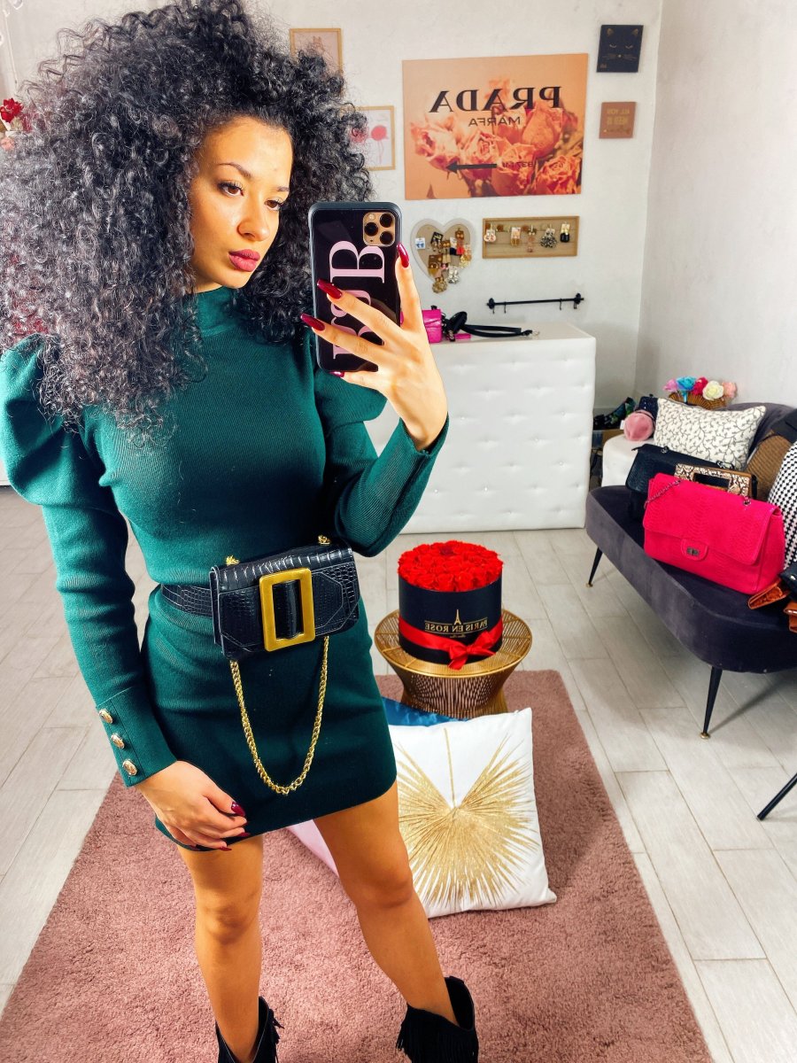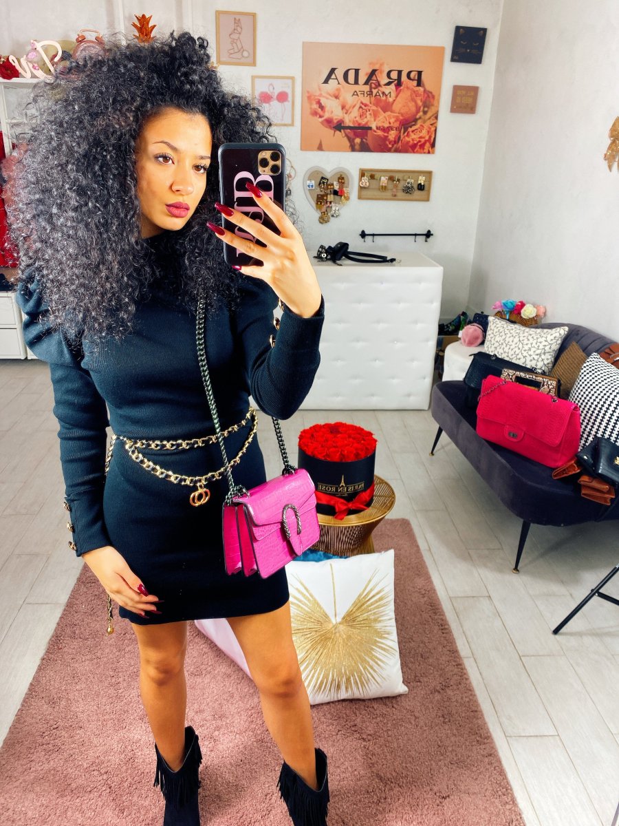 Tubino aderente lungo con bottoncini oro sulla manica. Spallina leggermente bombata
