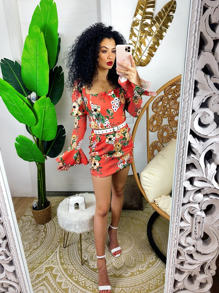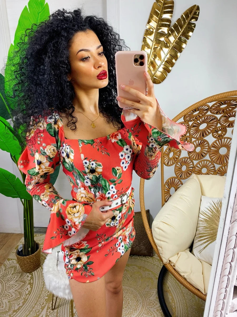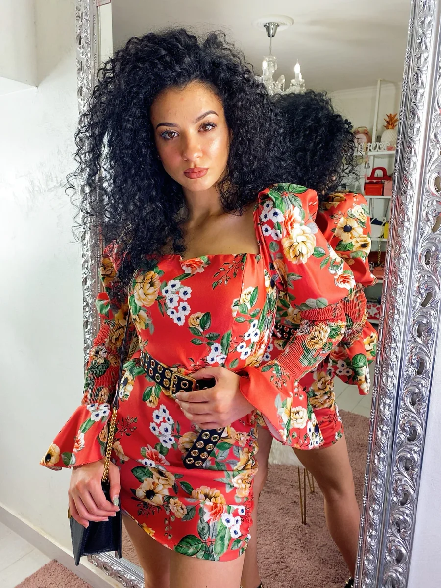 Abito in tessuto elasticizzato chiusura con zip dietro. Arricciato sul davanti e manica bombata. Stampa fiorata sui toni azzurrini