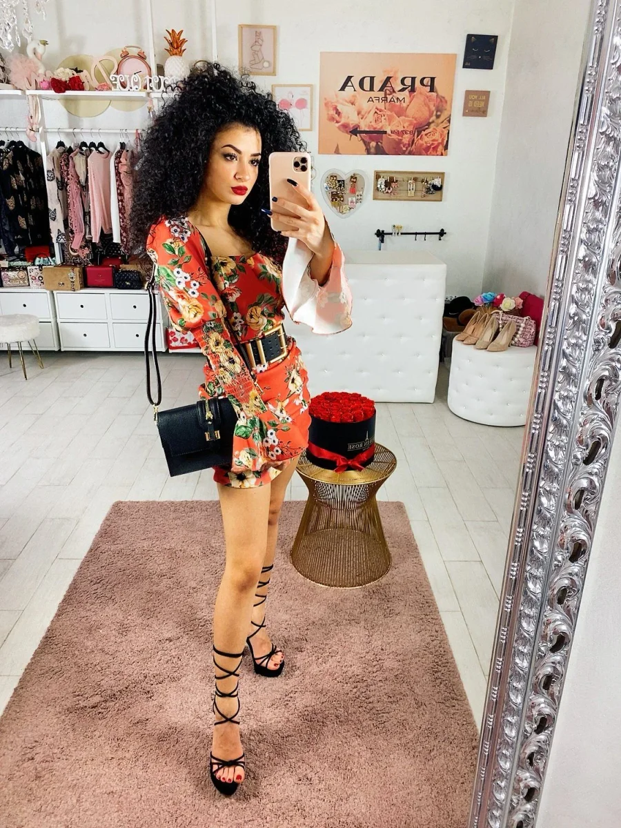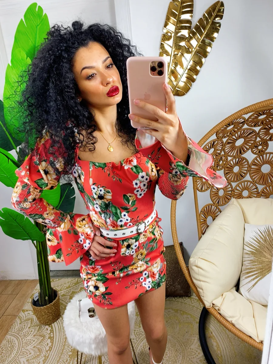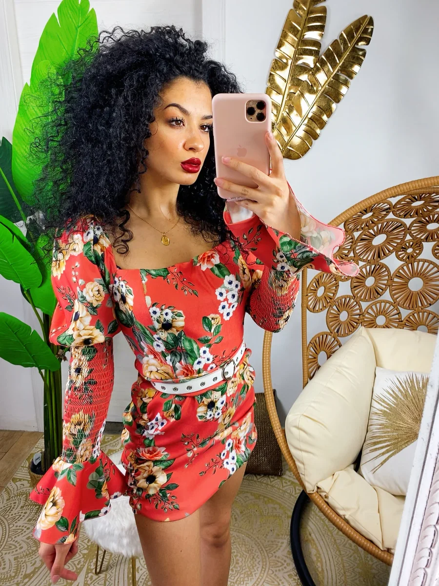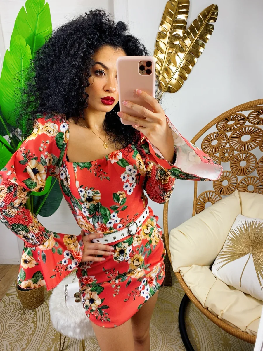 Abito in tessuto elasticizzato chiusura con zip dietro. Arricciato sul davanti e manica bombata. Stampa fiorata sui toni azzurrini