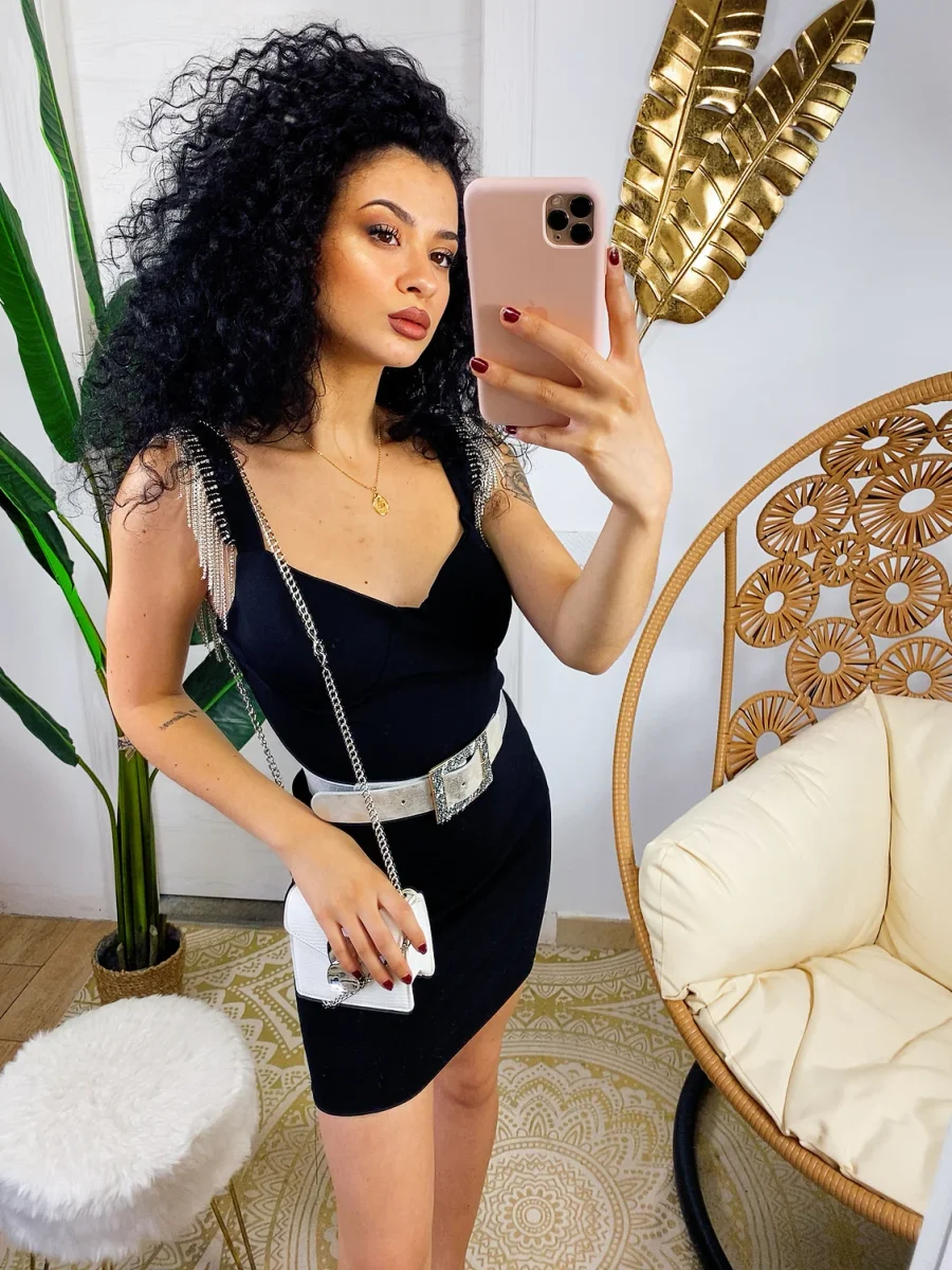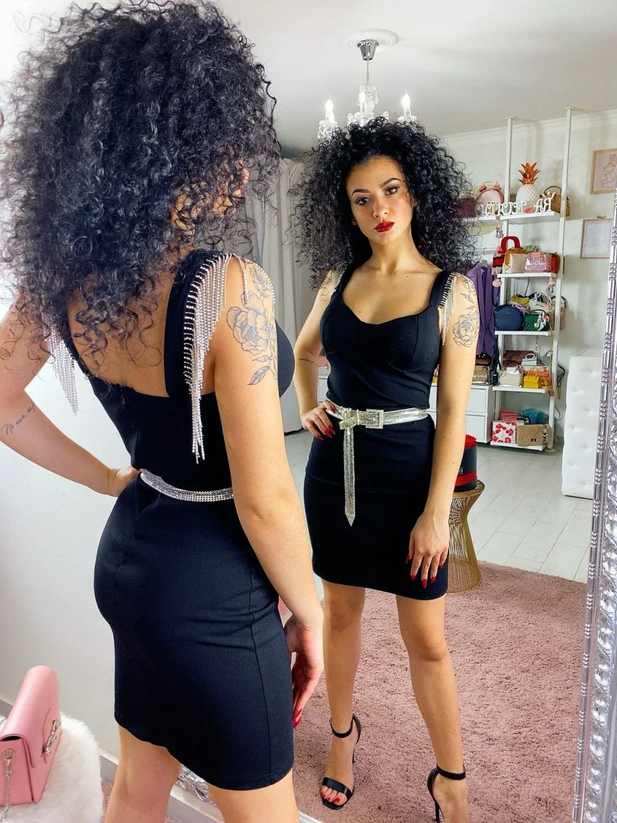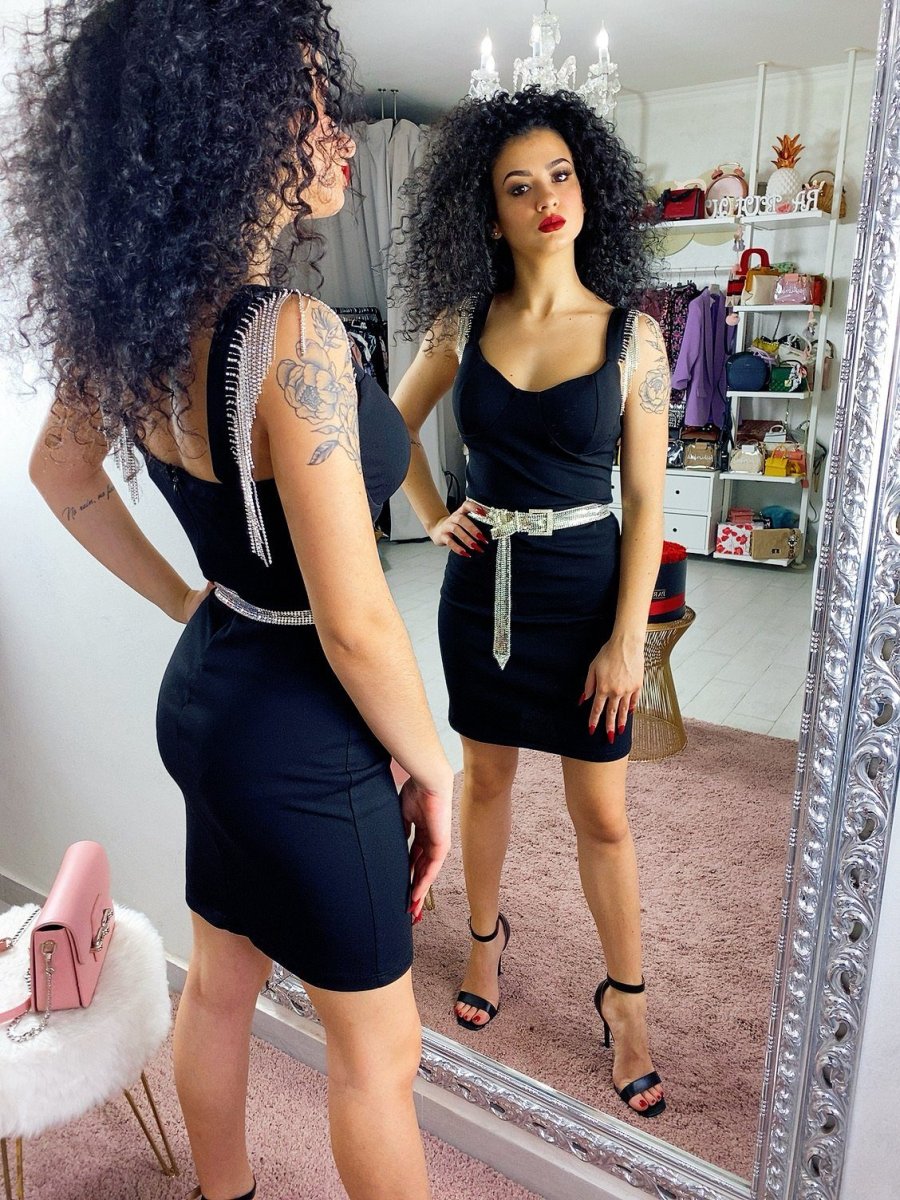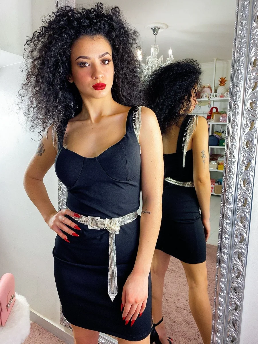Tubino aderente con coppe e scollo a V. Particolari frange di strass sulle spalline. Chiusura con zip dietro la schiena