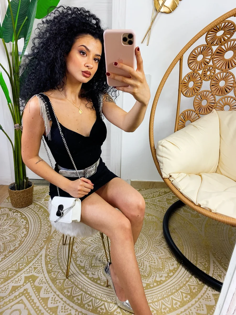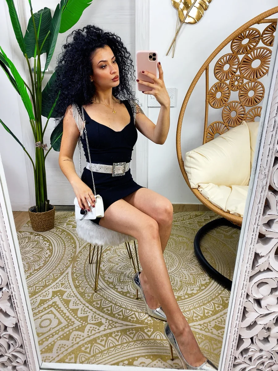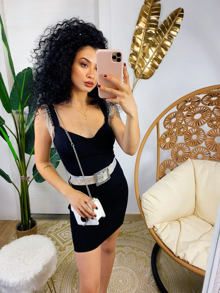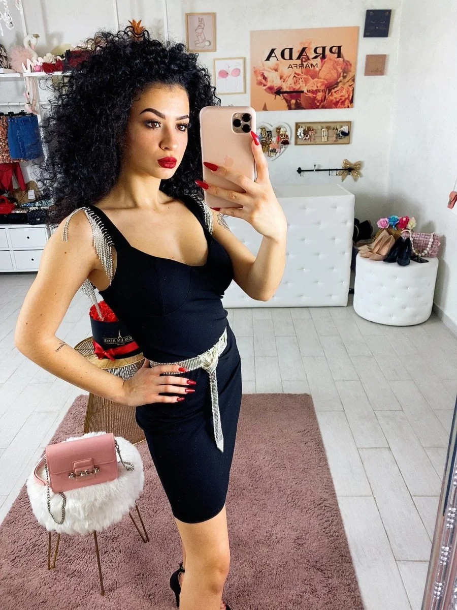 Tubino aderente con coppe e scollo a V. Particolari frange di strass sulle spalline. Chiusura con zip dietro la schiena