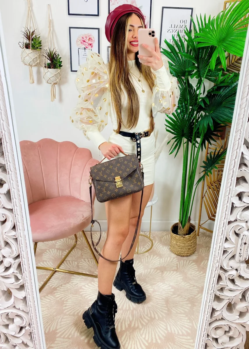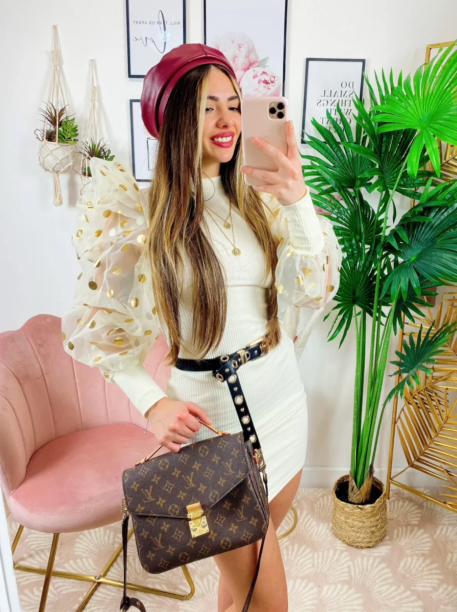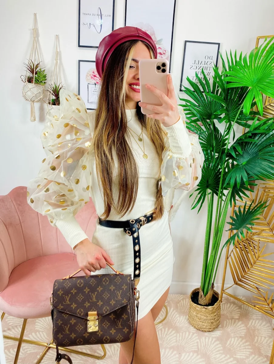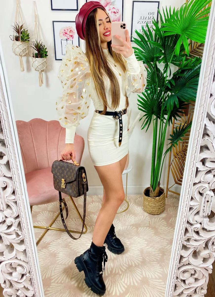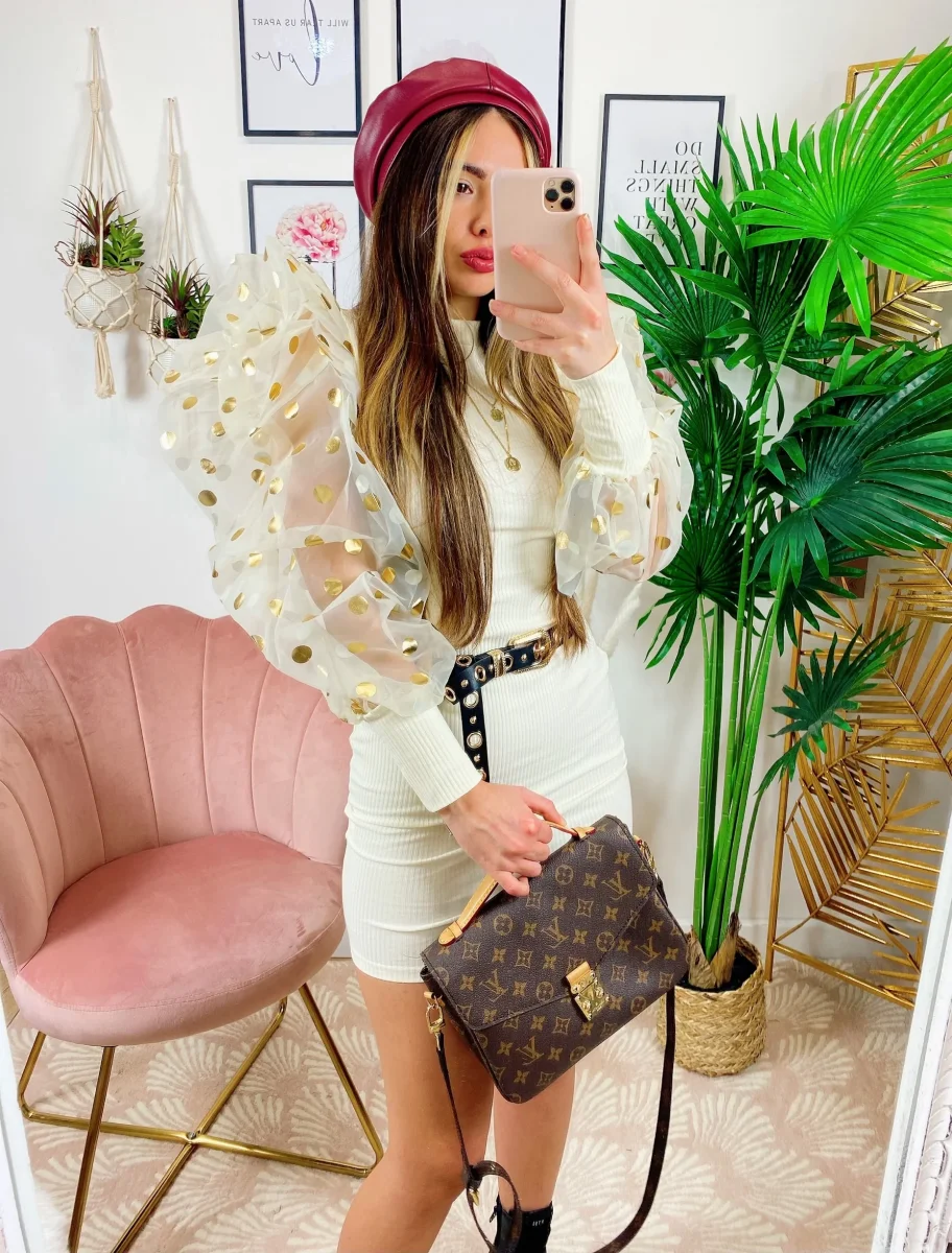 Tubino in tessuto aderente pesante con maniche pompose velate con maxi pois