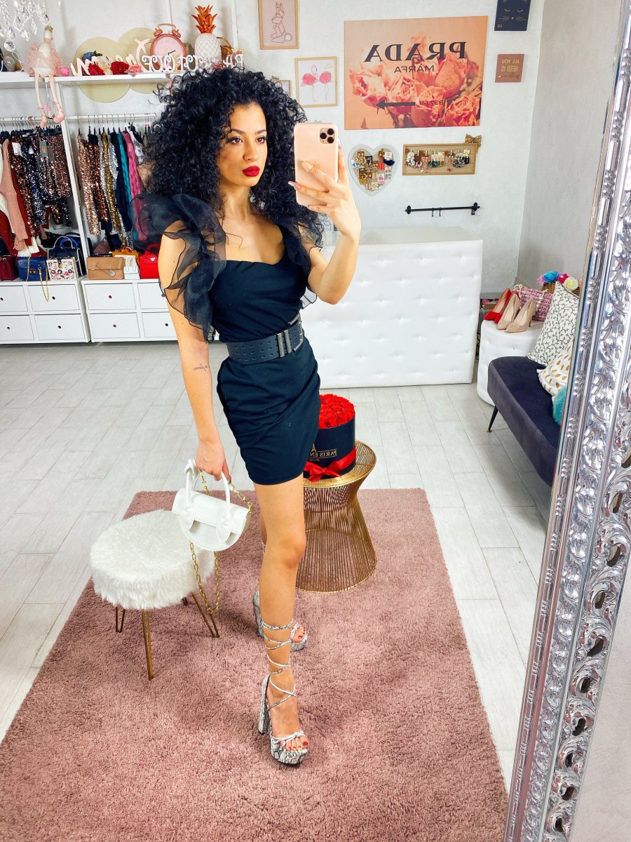 Tubino arricciato aderente con scollo sul seno. Manica corta e rouge velata.