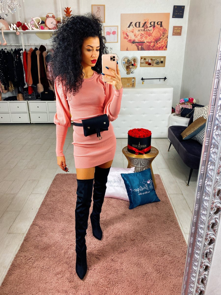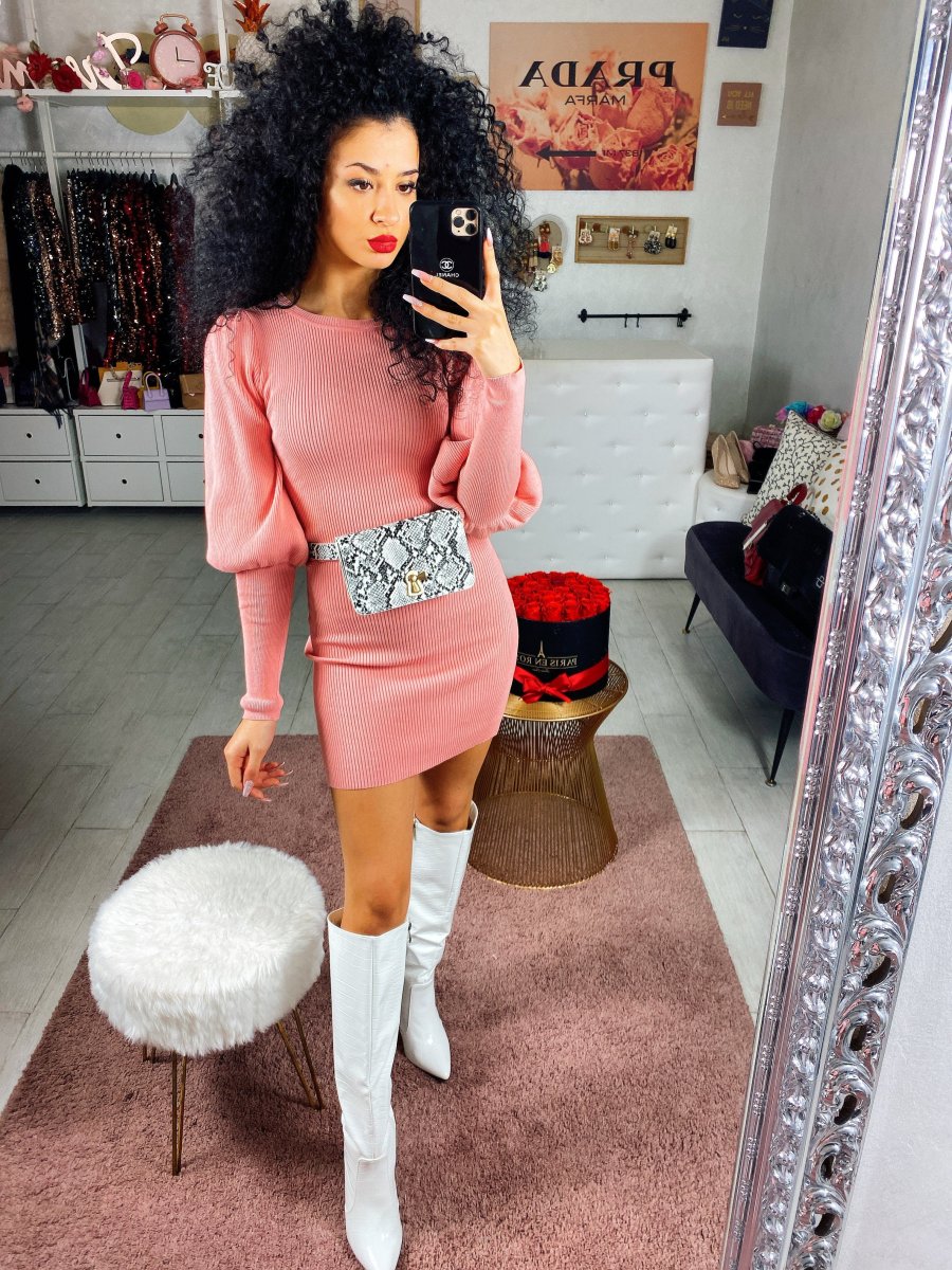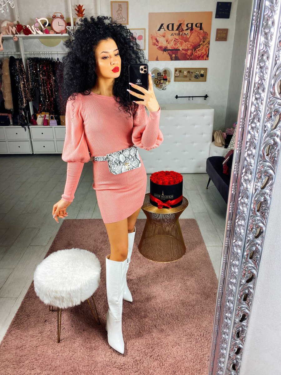 Tubino lungo in tessuto a costine con manica molto aderente. Tessuto elasticizzato. Modello medio lungo