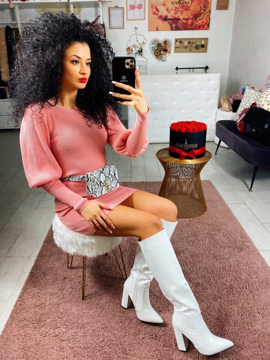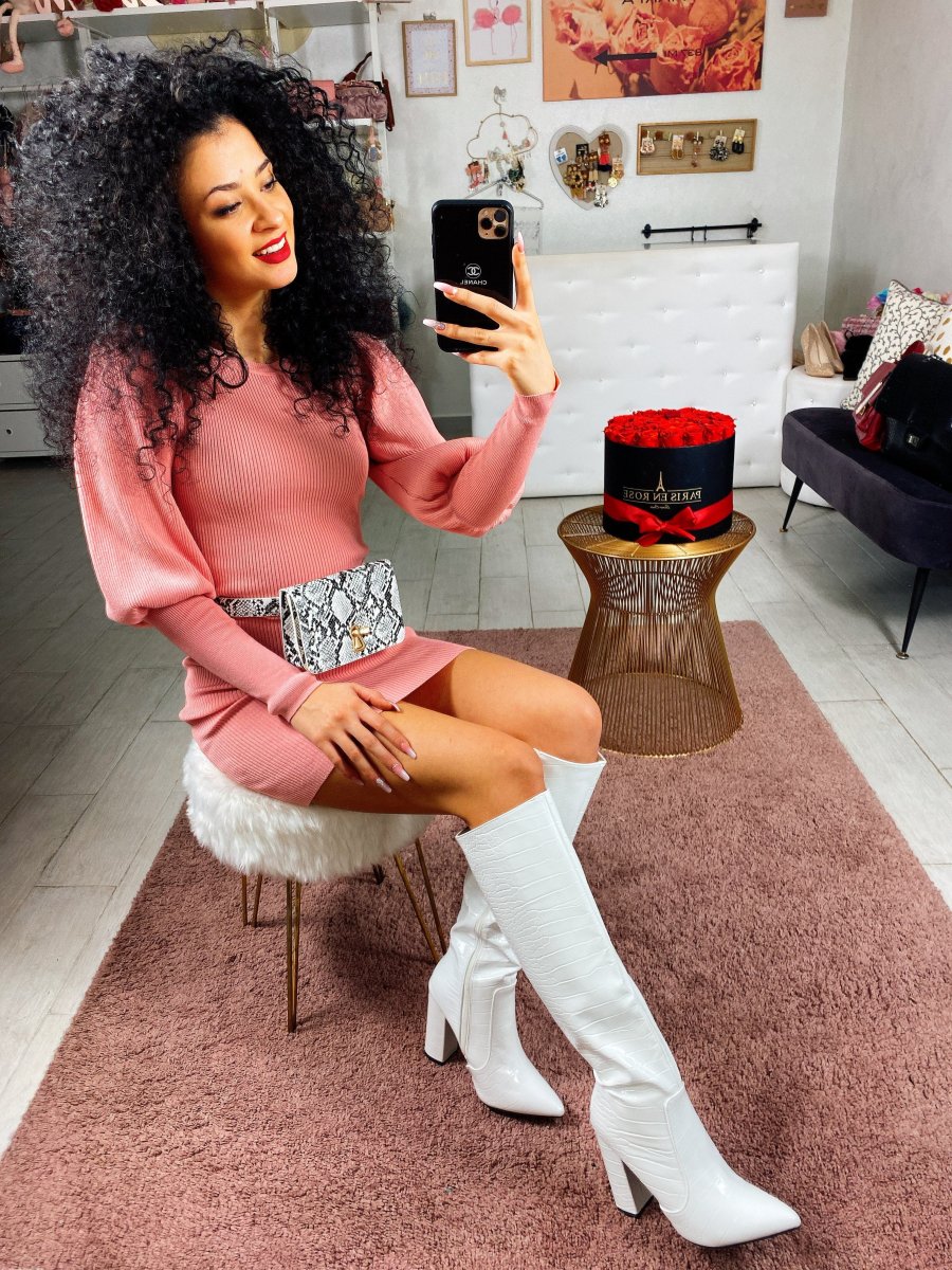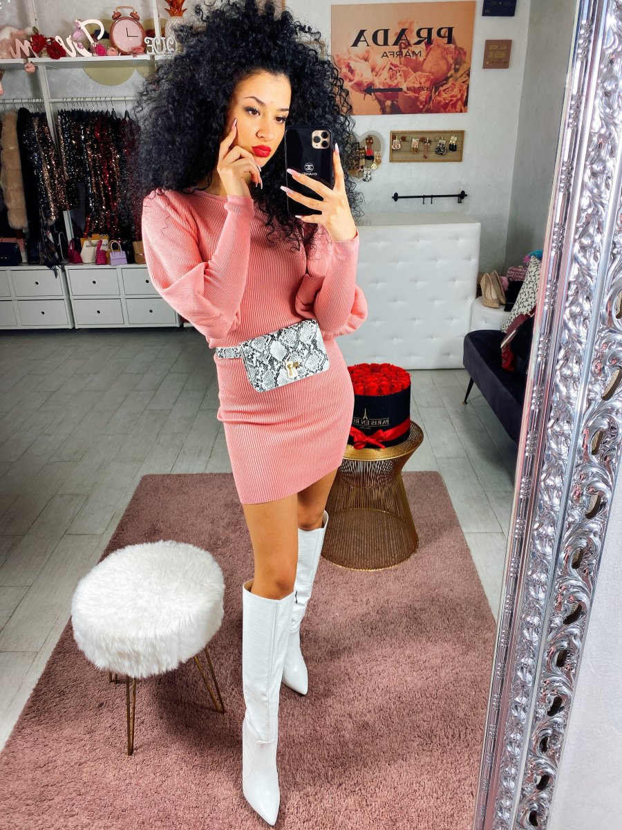 Tubino lungo in tessuto a costine con manica molto aderente. Tessuto elasticizzato. Modello medio lungo