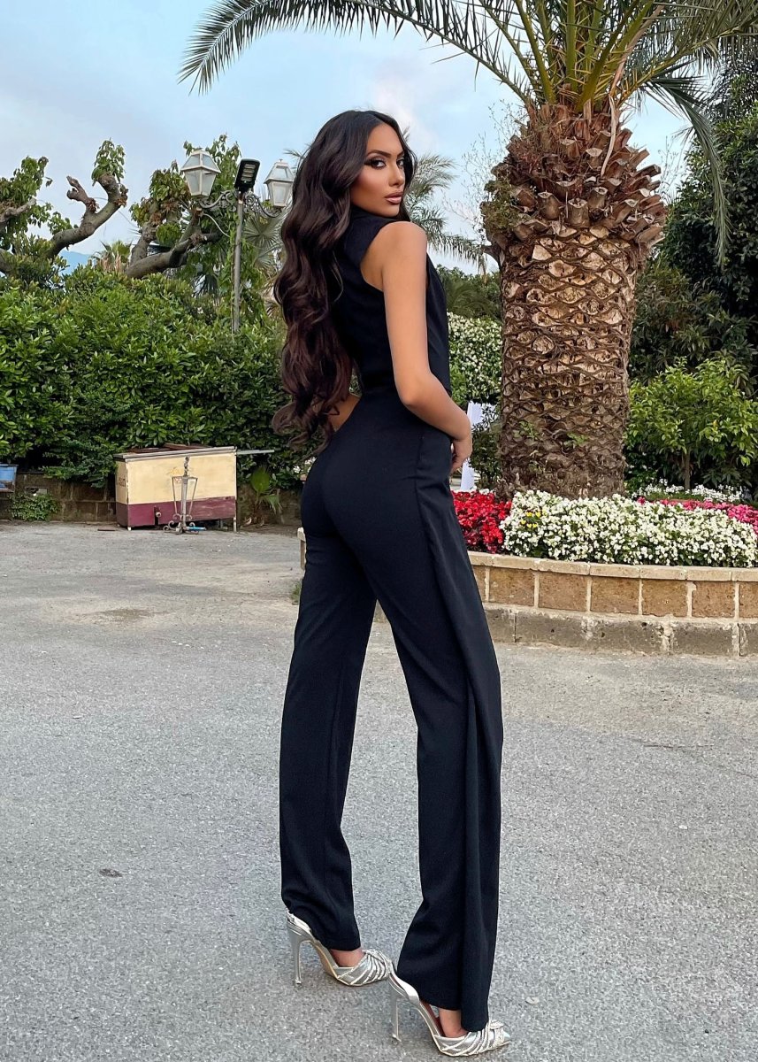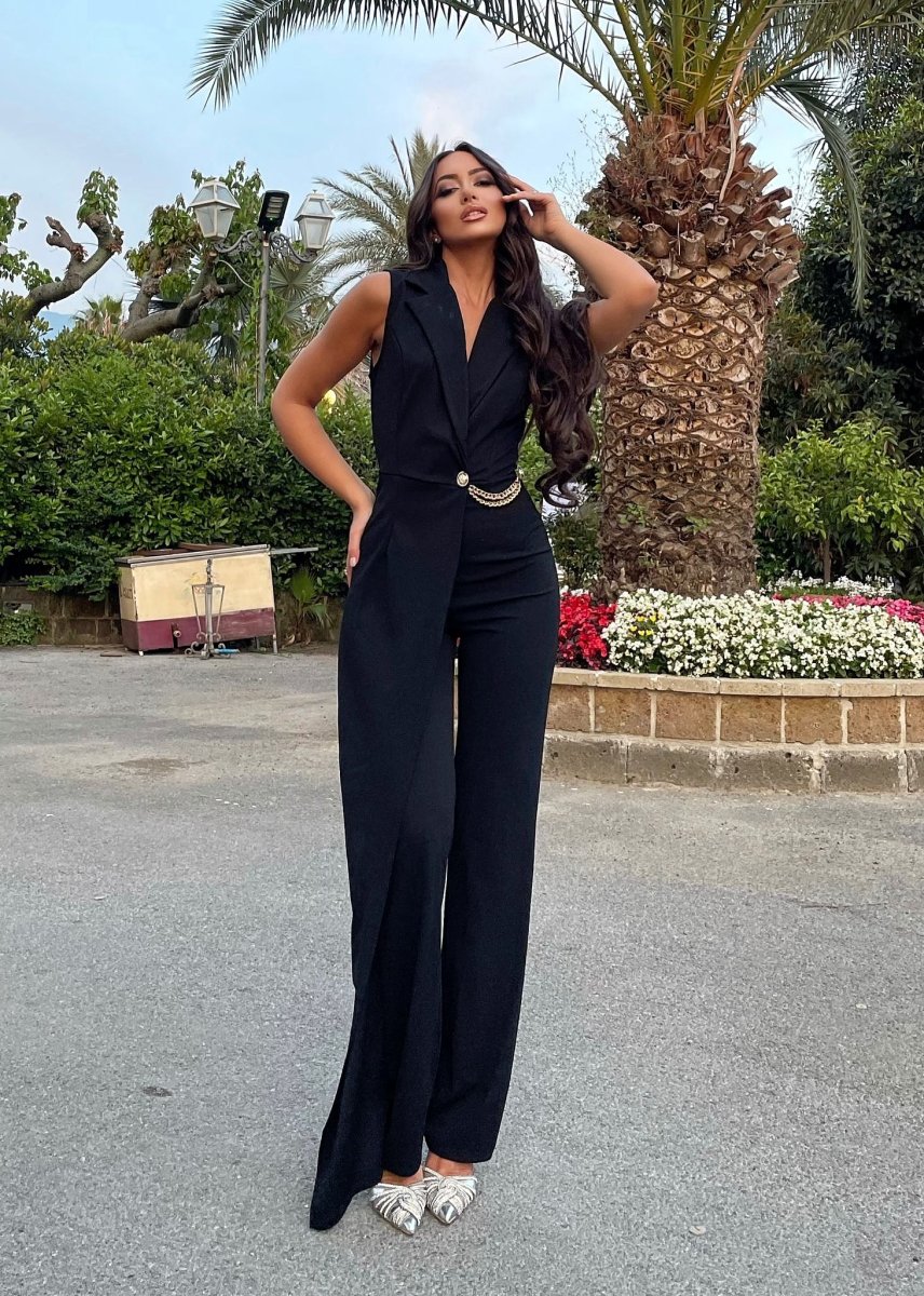 Tuta a palazzo in tessuto elasticizzato effetto blazer con zip e catenina