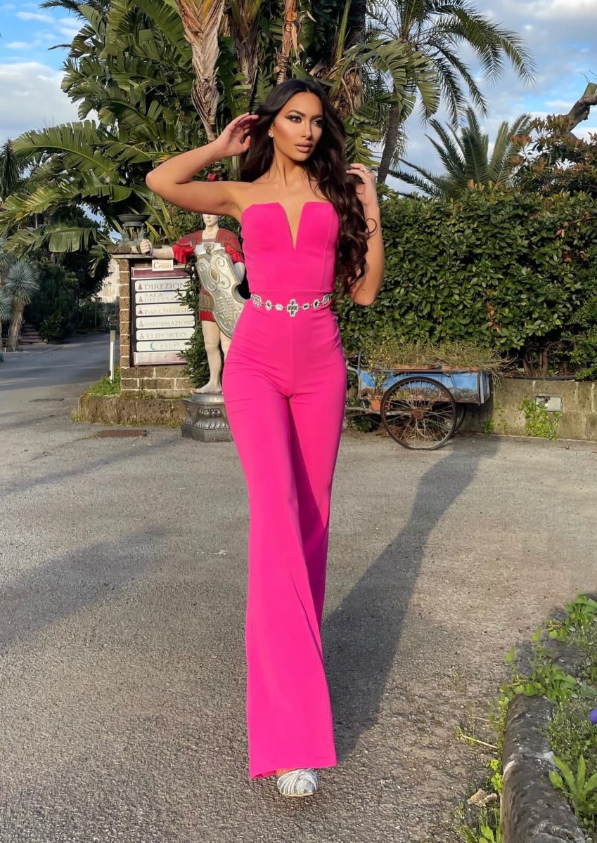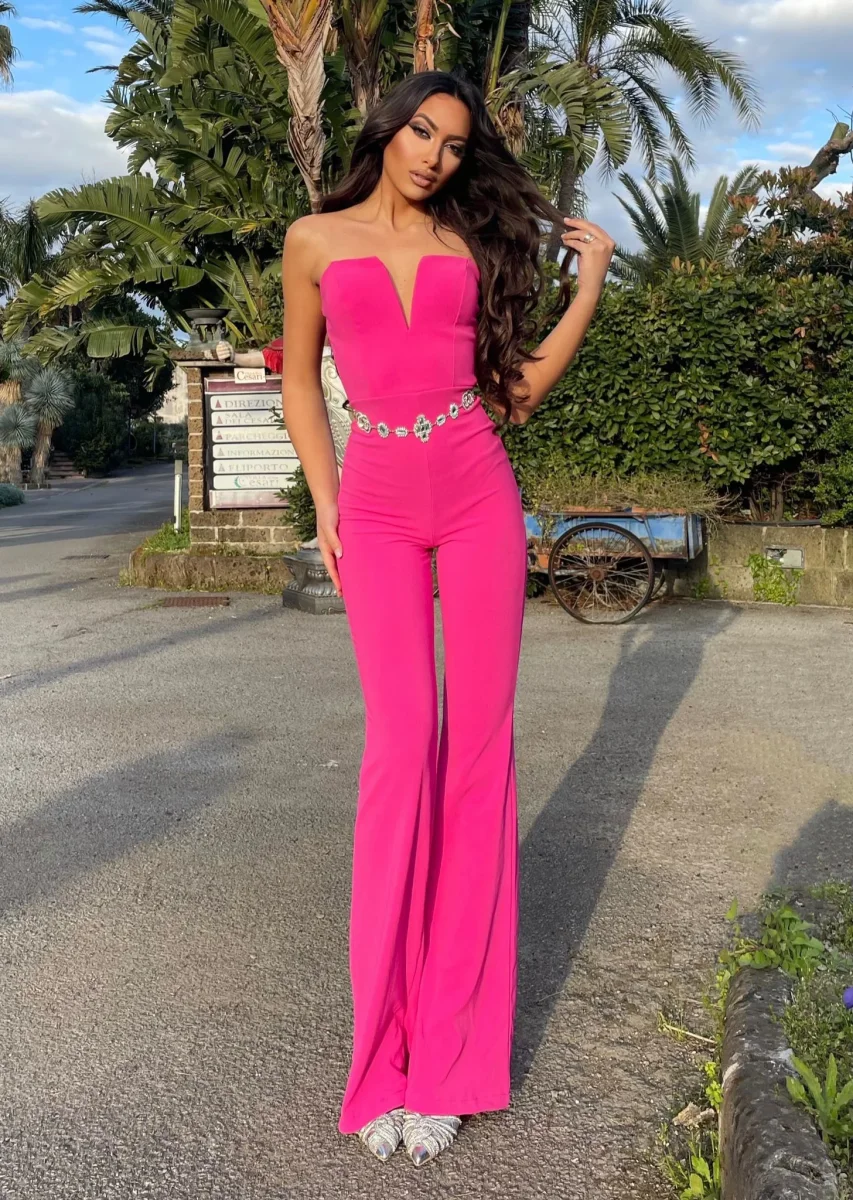 Tuta a palazzo in tessuto a costine ma comunque elegante, portabile con o senza spalline. Con coppe.