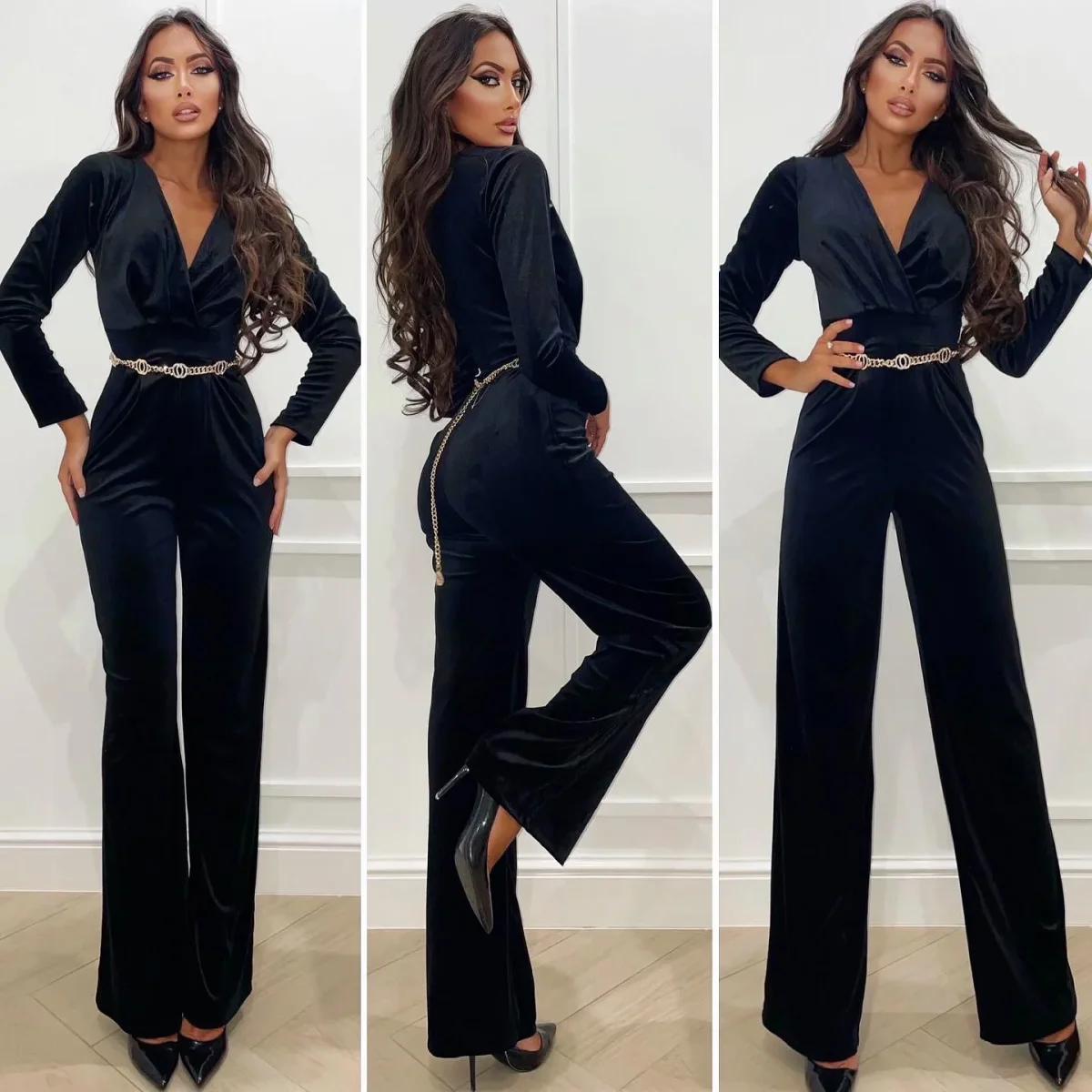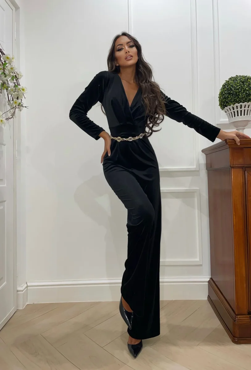 Tuta a palazzo in ciniglia con scollo a V coppe e chiusura con zip.
