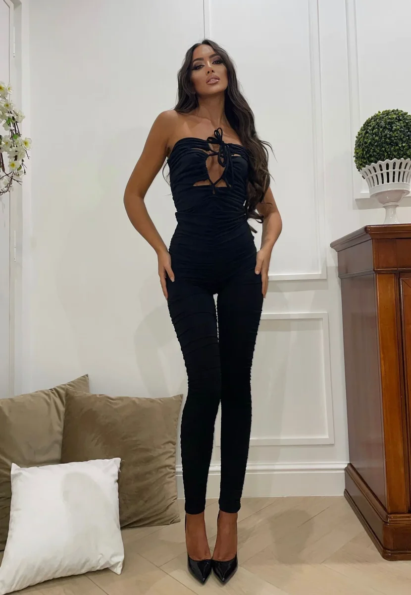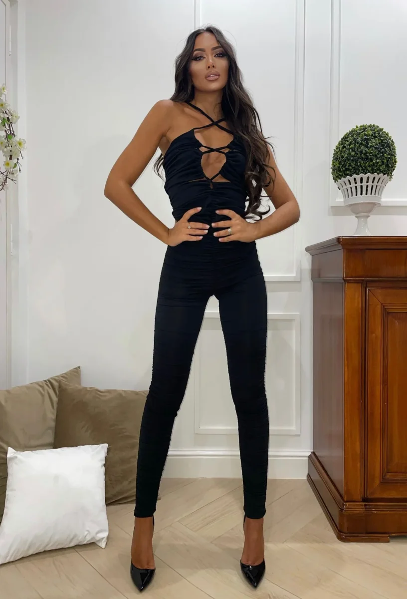 Tuta aderente in tessuto raso liscio con lacci sul davanti regolabile a vostra scelta .
