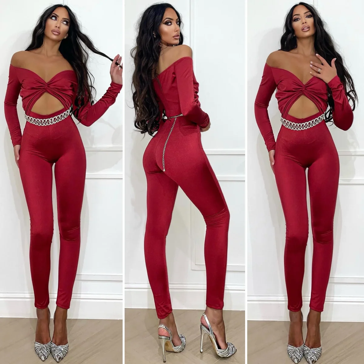 Tuta aderente in tessuto elasticizzato e scollo a barca nodo sul davanti