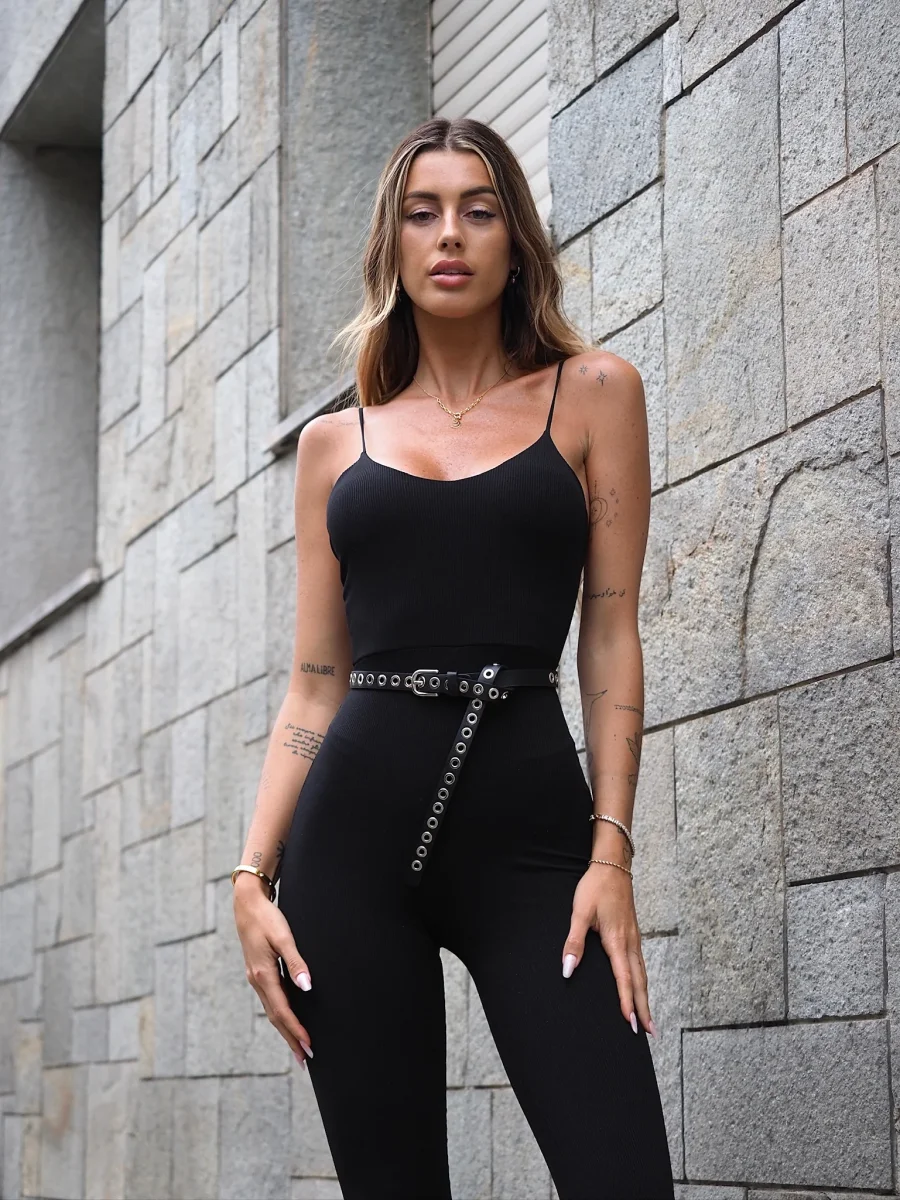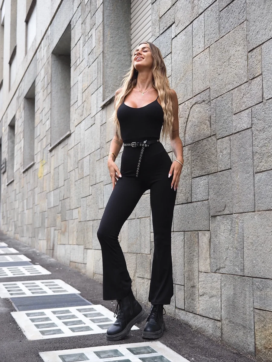 Tuta a costine con coppe e spalline, pantalone a palazzo