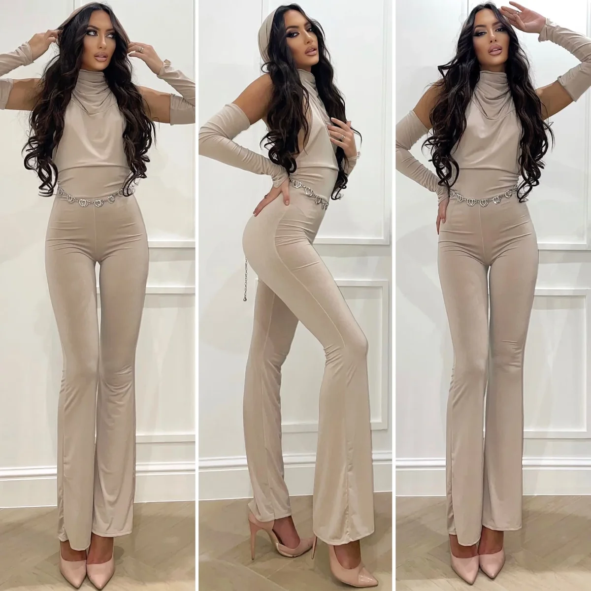 Tuta in tessuto molto elasticizzato aderente e fasciante con manicotti e cappuccio incluso.