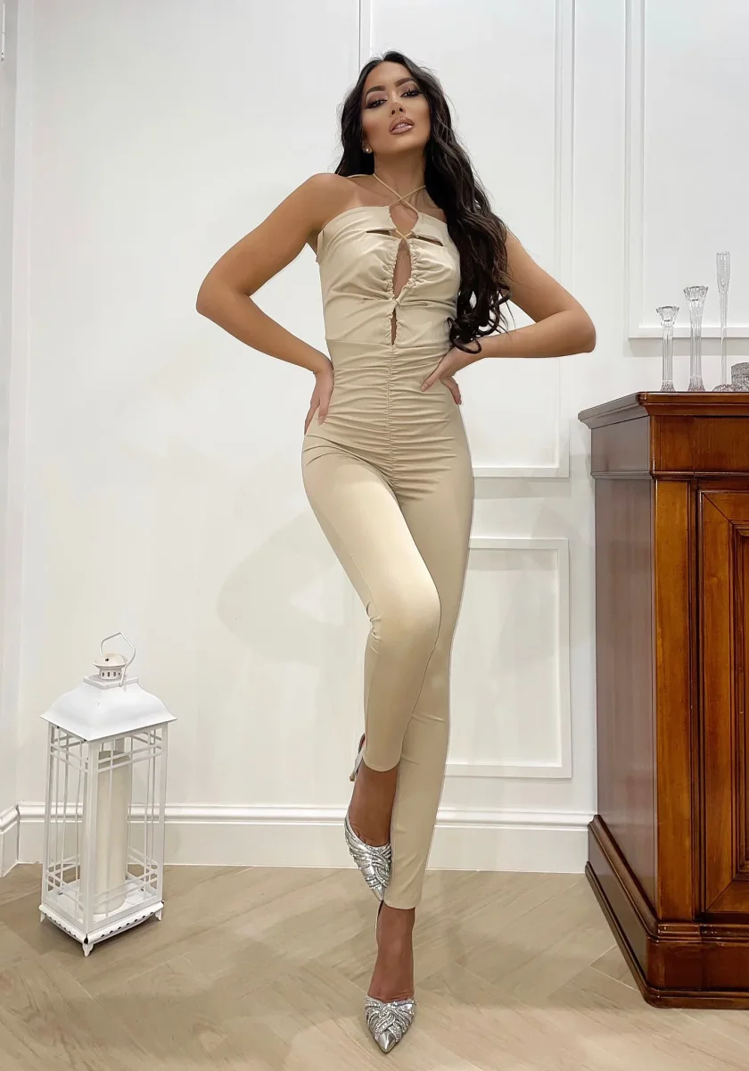 Tuta aderente nera con incrocio regolabile sul davanti. Senza coppe