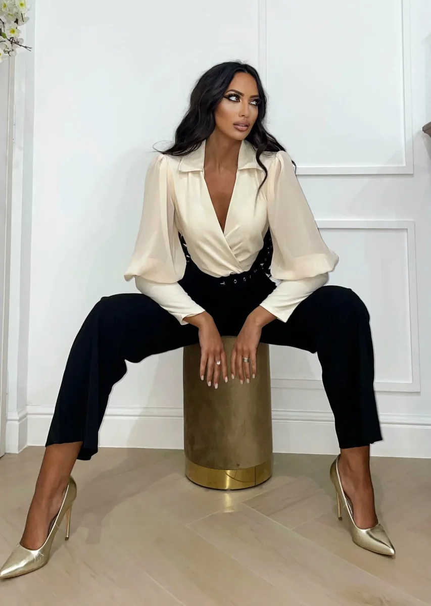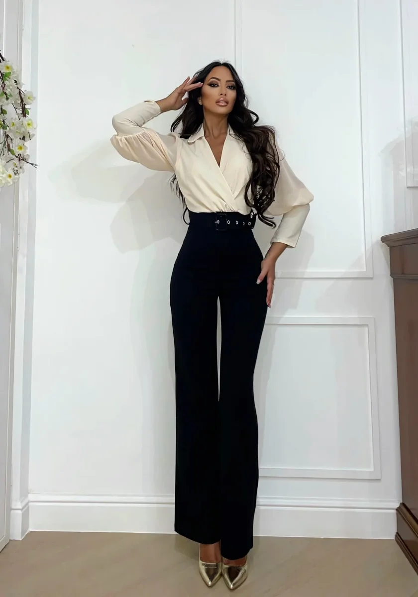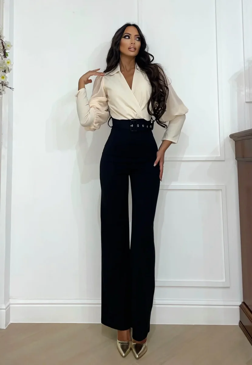 Tuta composta da top con scollo a V e manica a sbuffo e pantalone a palazzo con cintura chiusura con zip