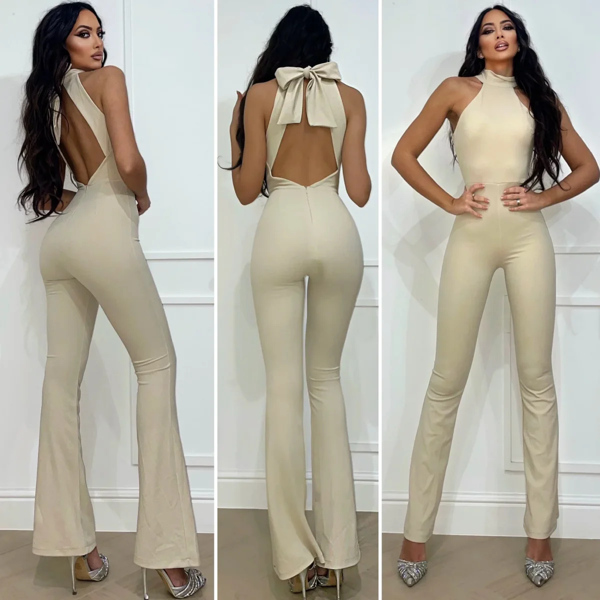 Tuta aderente in tessuto elasticizzato con schiena aperta e chiusura con bottoni dietro al collo, pantalone a palazzo e elastico in vita.