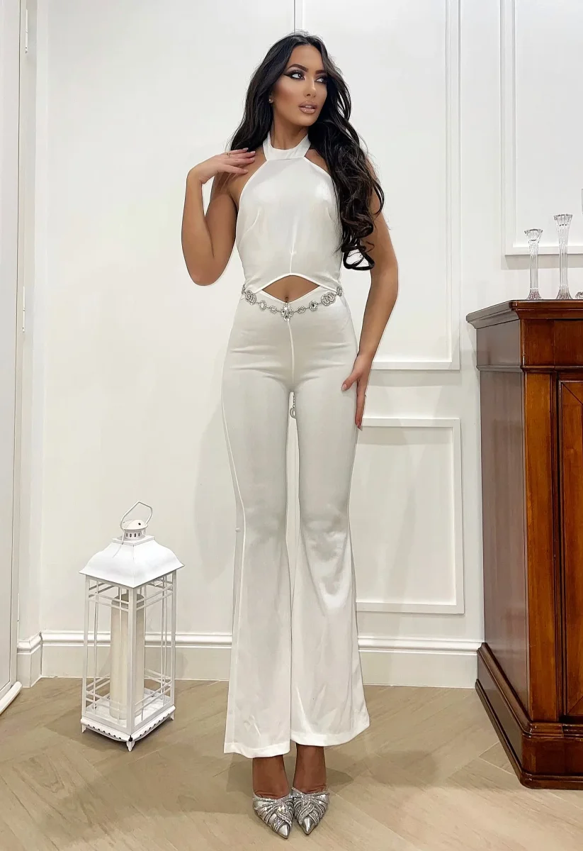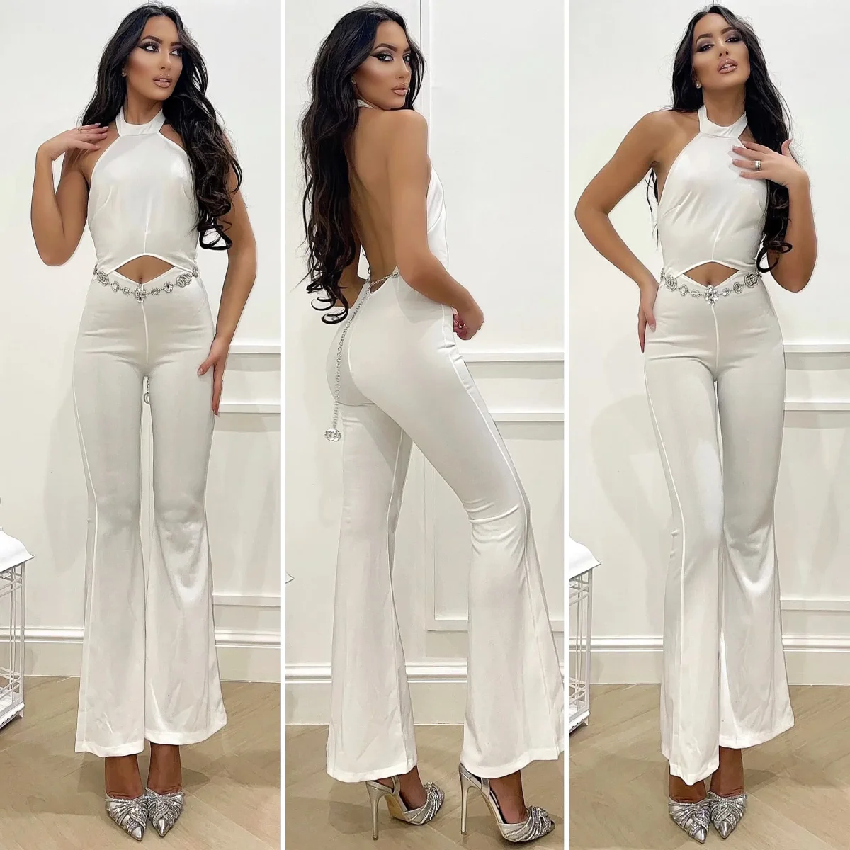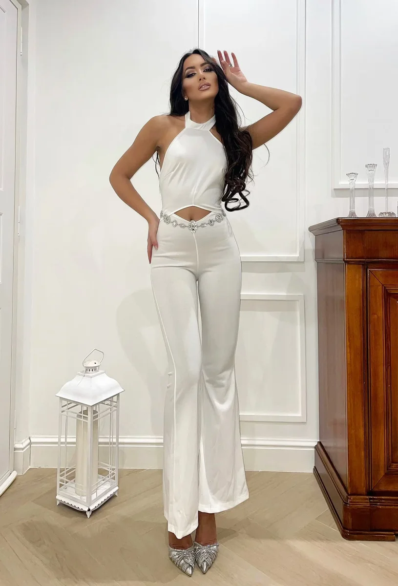Tuta a zampa in tessuto elasticizzato, chiusura al collo e apertura sulla pancia. Schiena semi aperta e senza coppe.