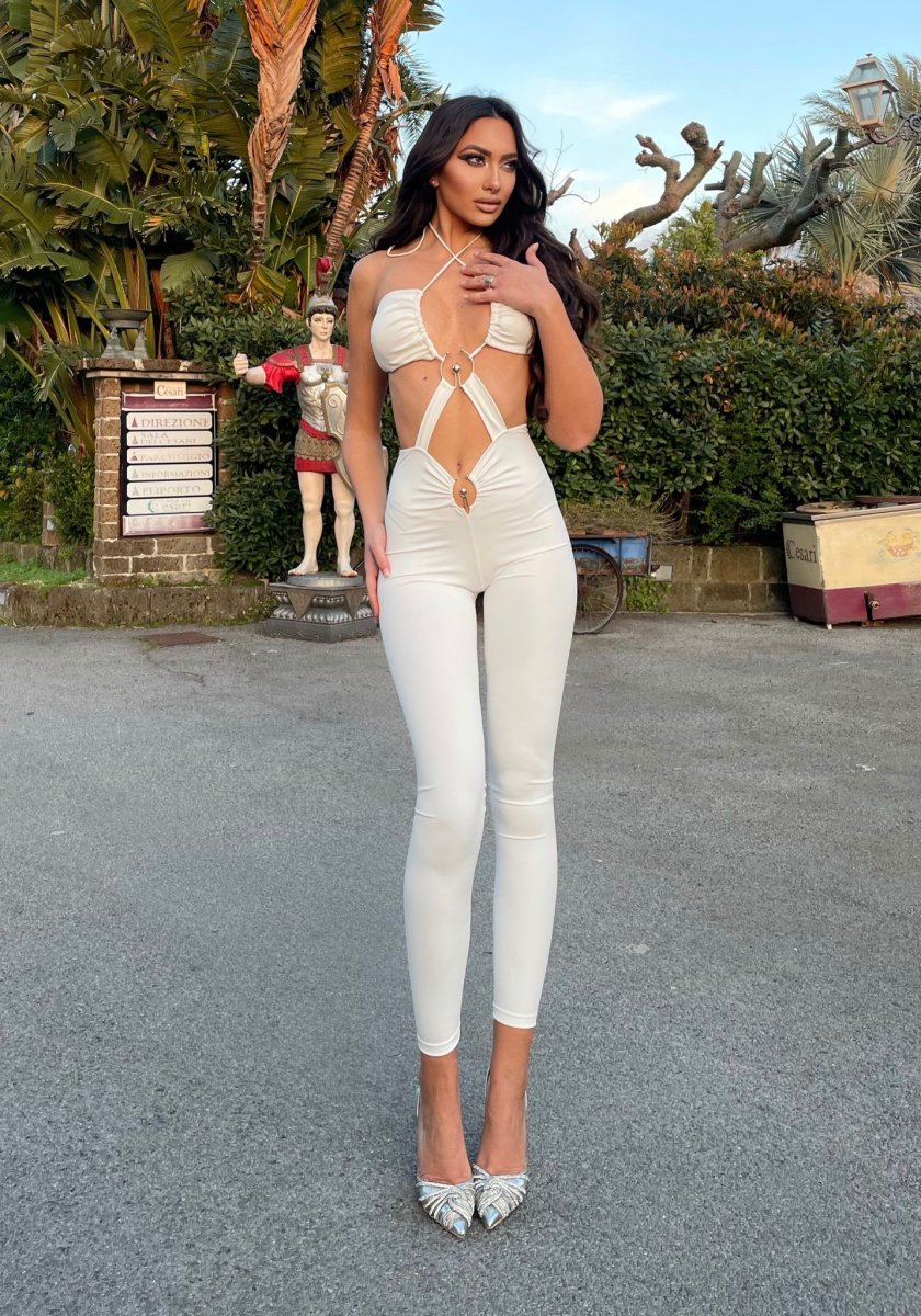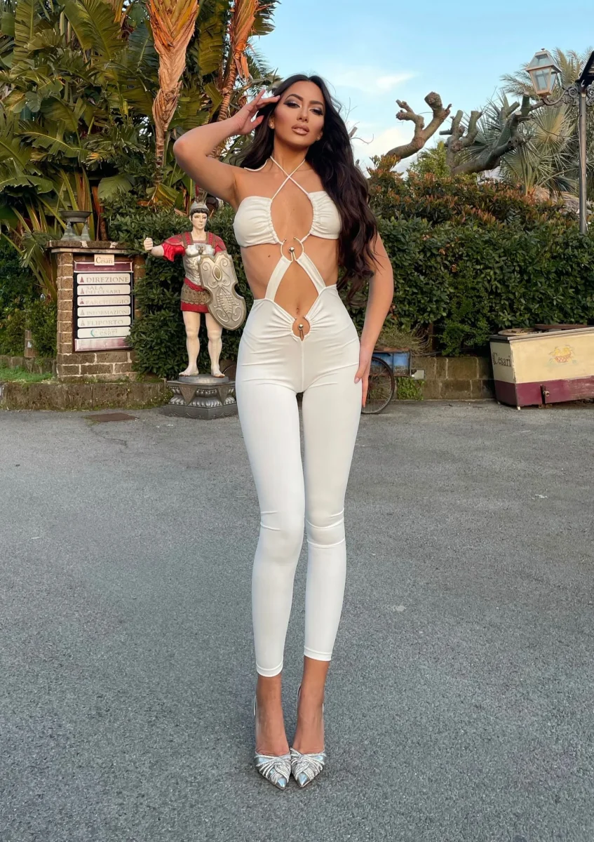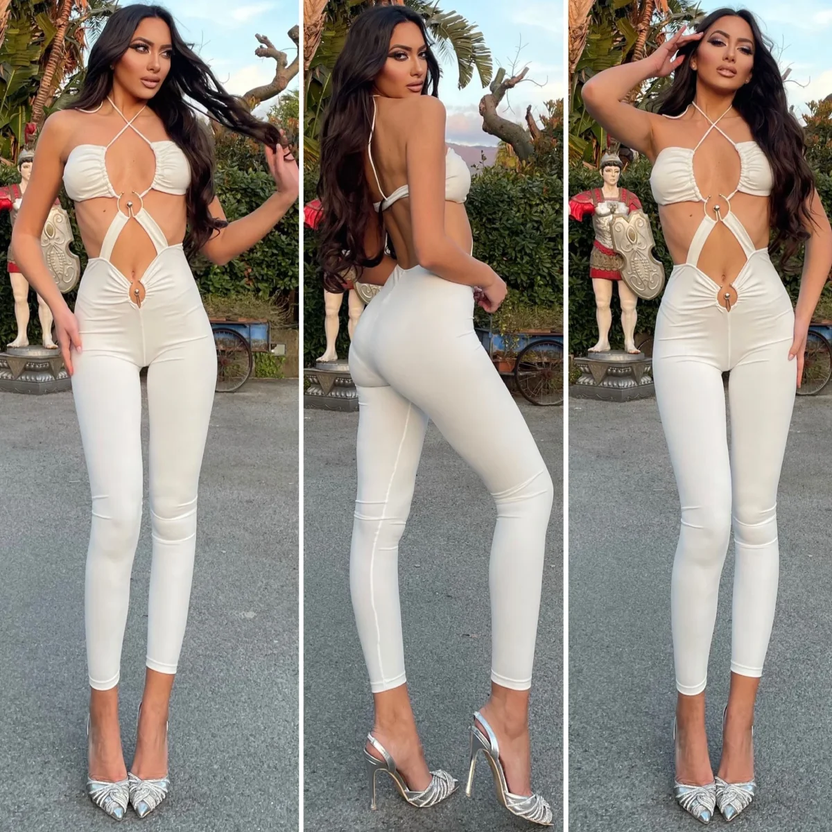 Tuta in lycra in tessuto aderente e elasticizzato con coppe e anello oro sul davanti.