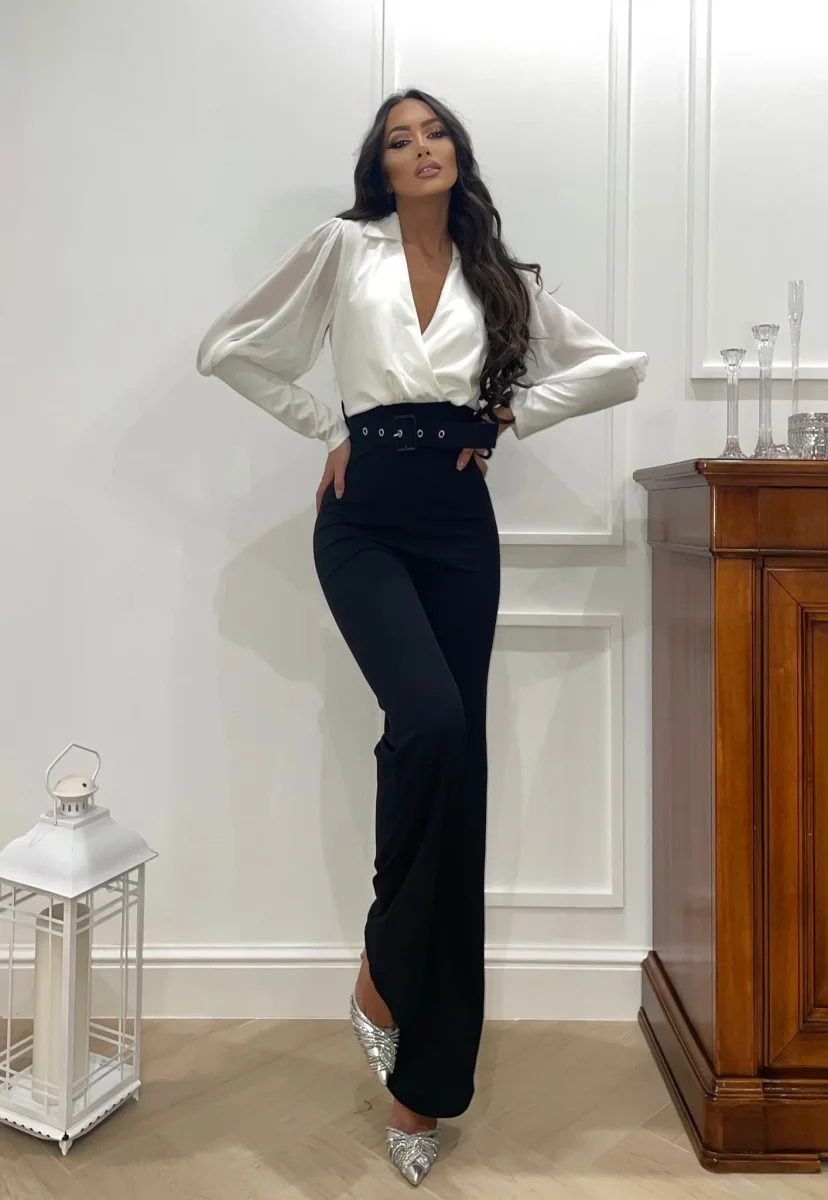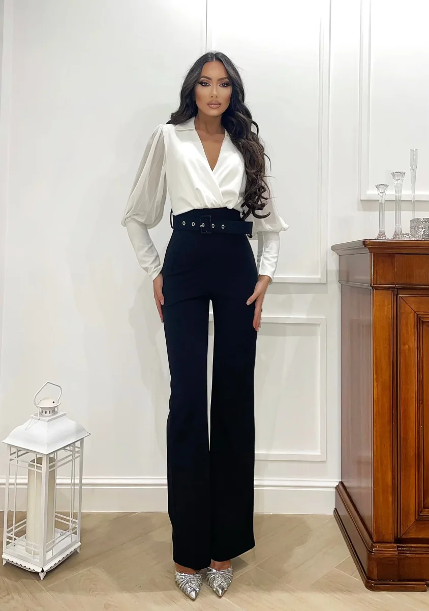 Tuta composta da top con scollo a V e manica a sbuffo e pantalone a palazzo con cintura chiusura con zip