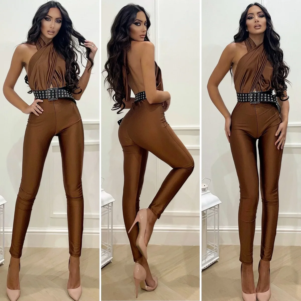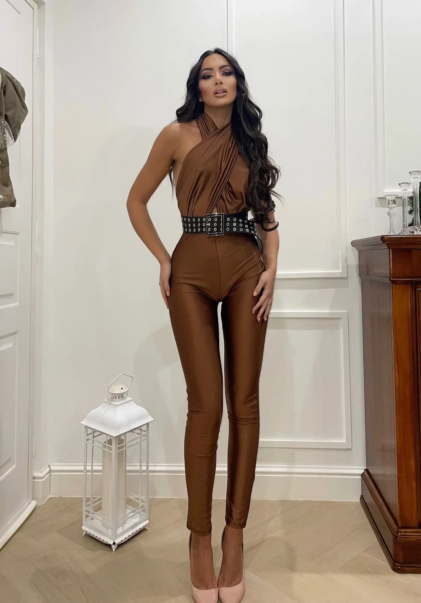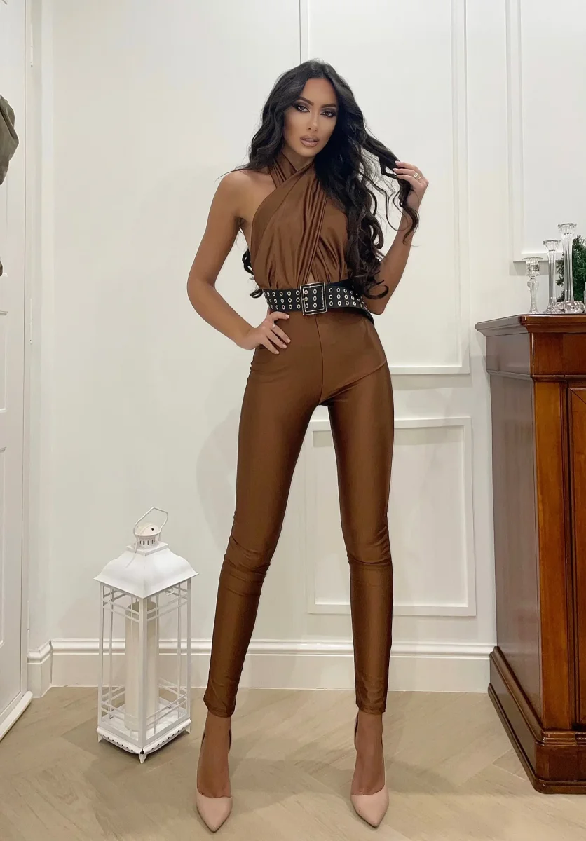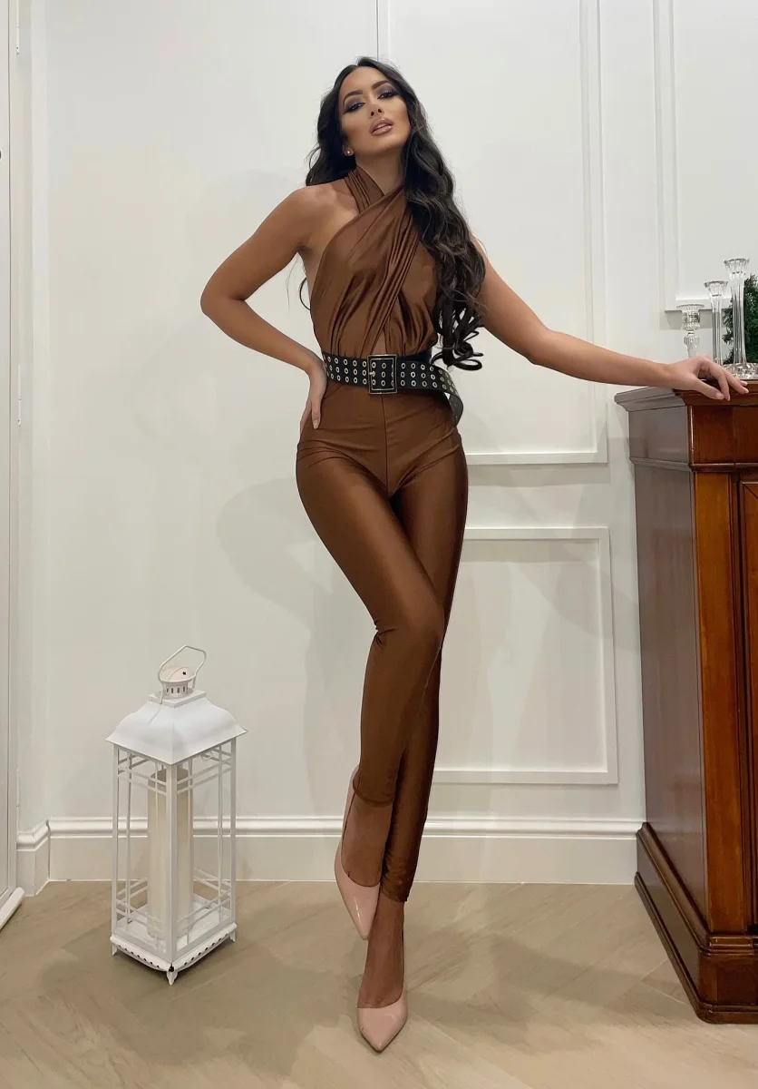 Tuta aderente in tessuto elasticizzato non trasparente con incrocio sul collo