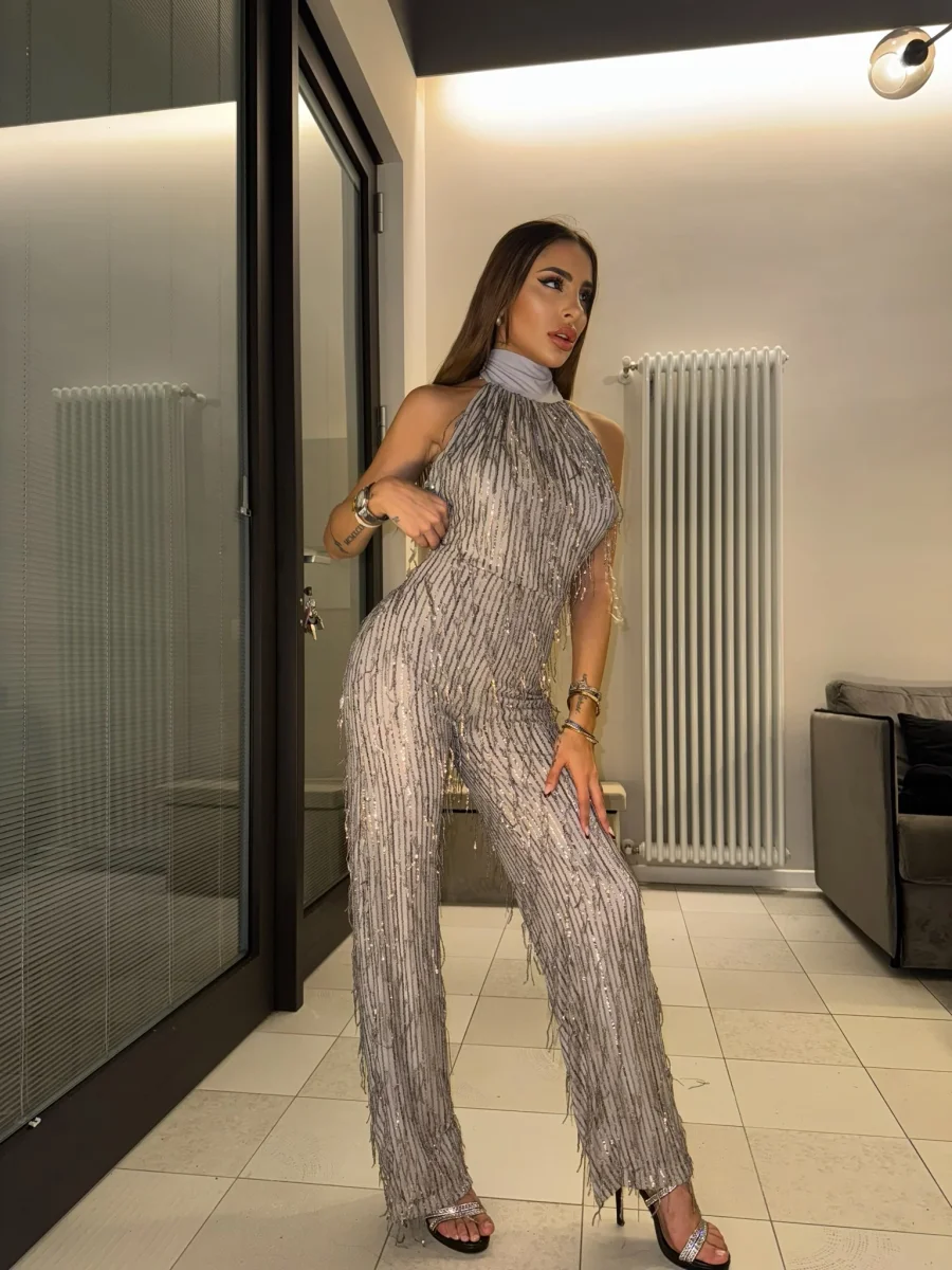 Tuta in tessuto aderente e elasticizzato con fodera, schiena semi aperto e laccio al collo