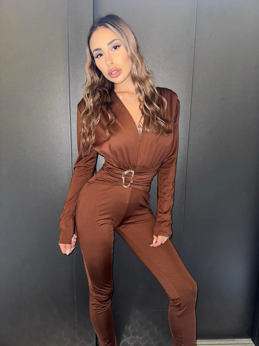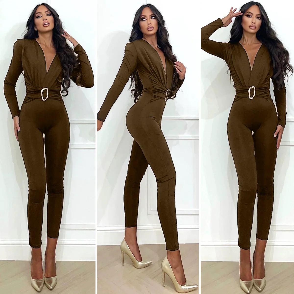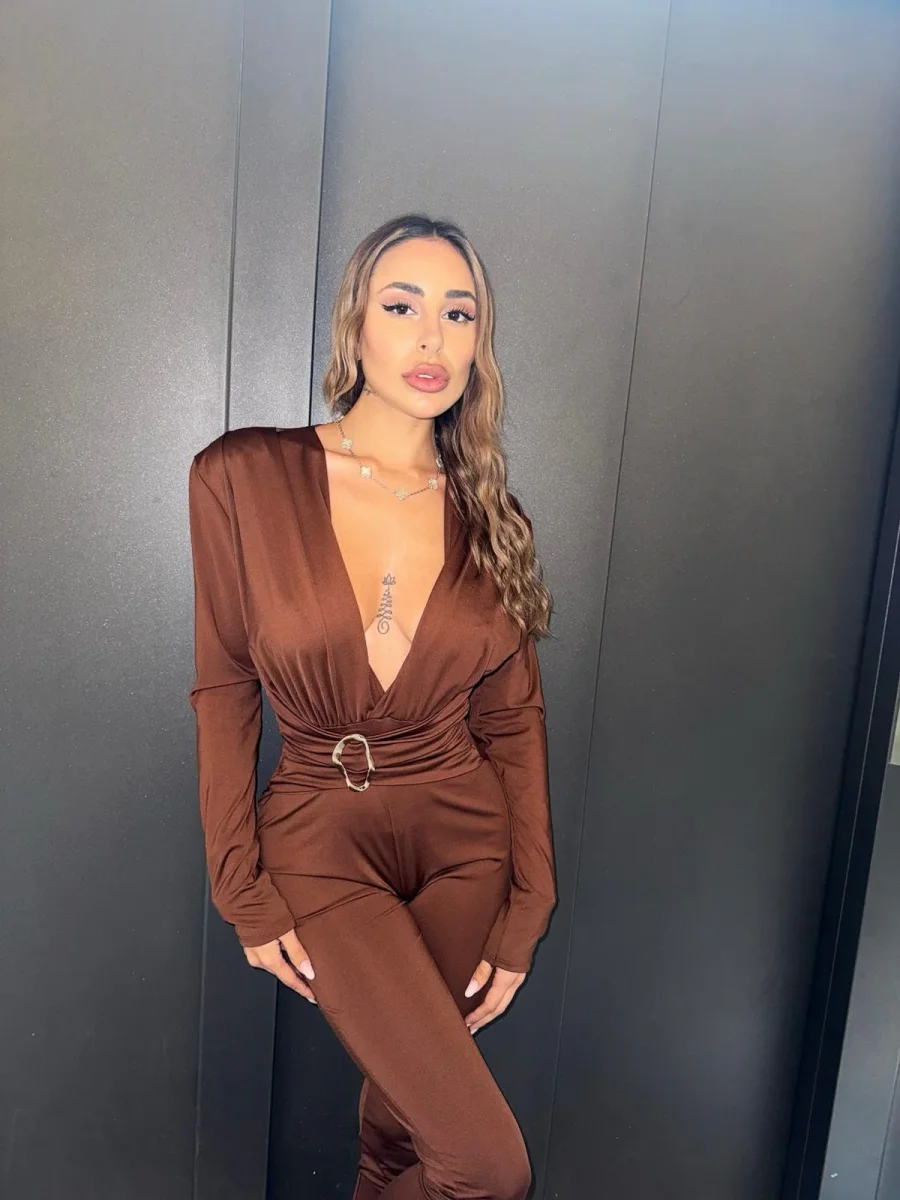 Tuta in lycra aderente e elasticizzata con spalle imbottite, scollo a V e gioiello oro