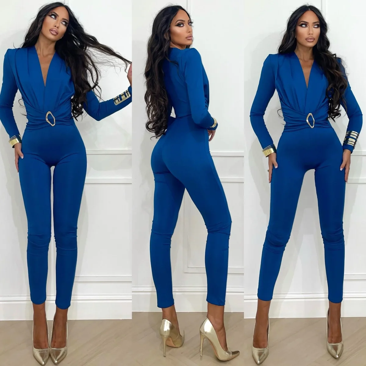 Tuta in lycra aderente e elasticizzata con spalle imbottite, scollo a V e gioiello oro. Colore leggermente tendente al petrolio