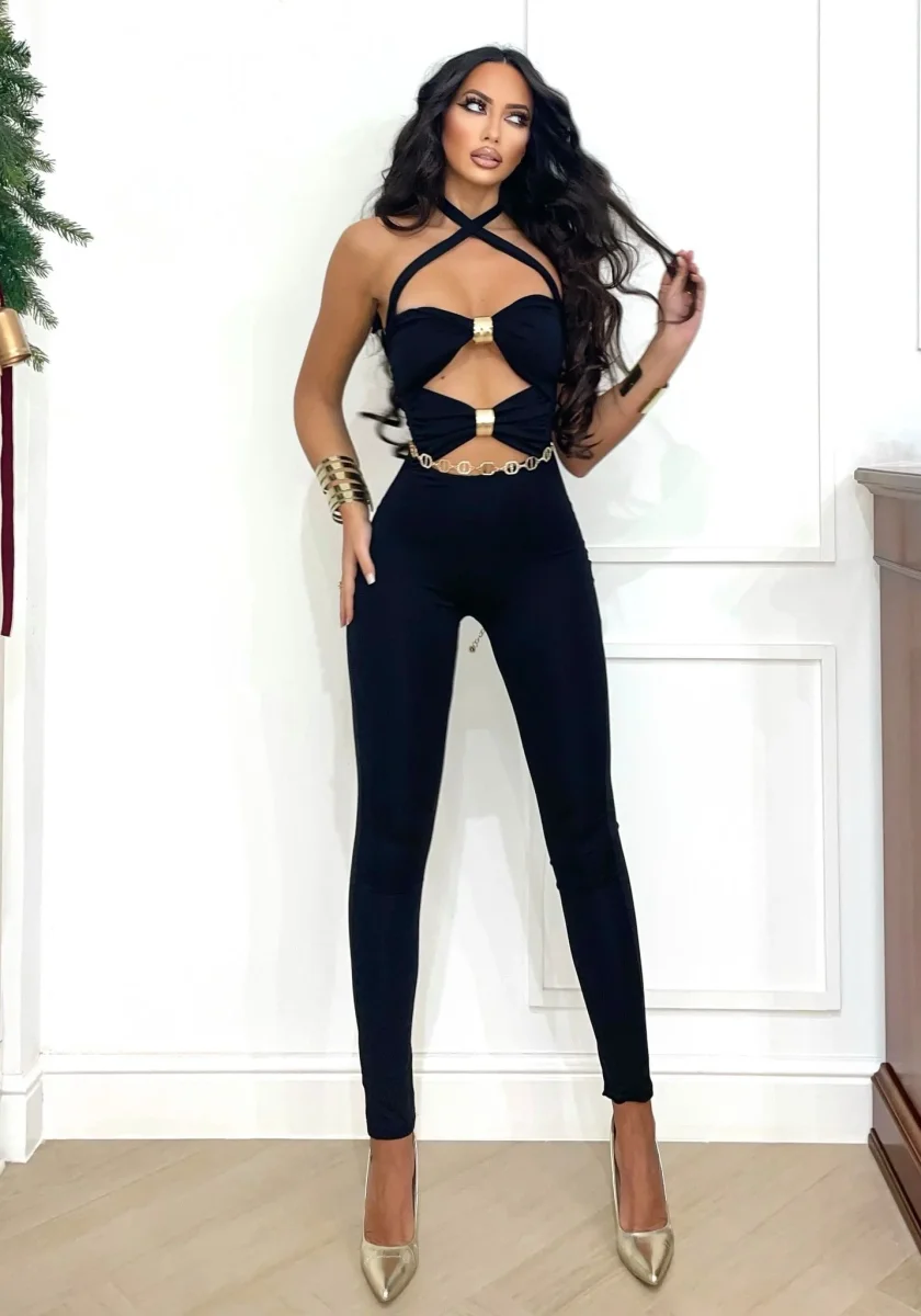 Tuta aderente in lycra con coppe e fiocchi con gioiello oro, incrocio al collo regolabile