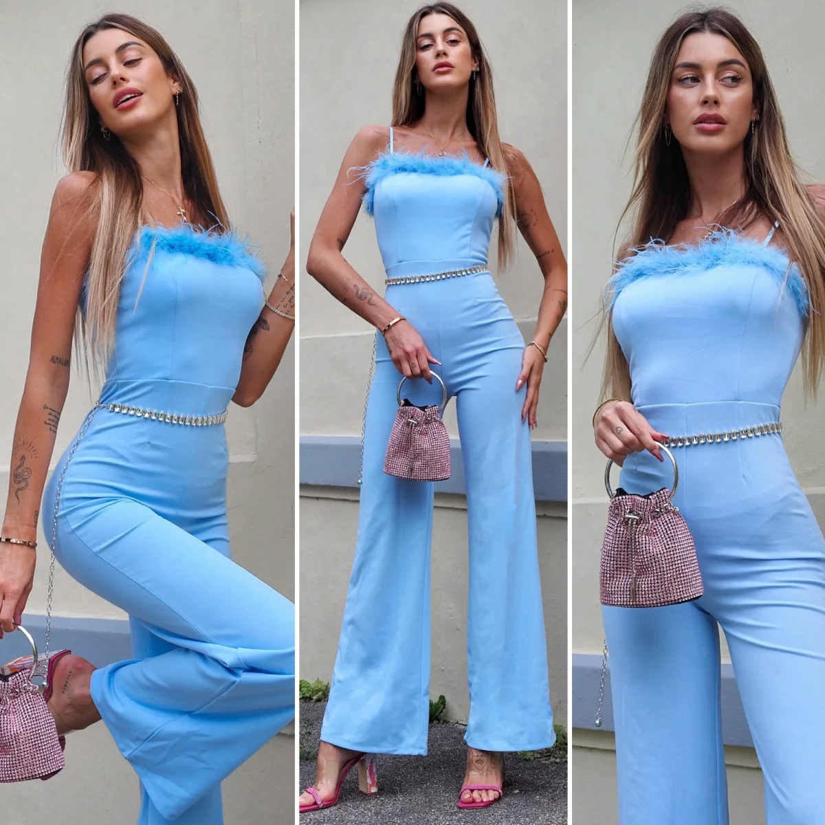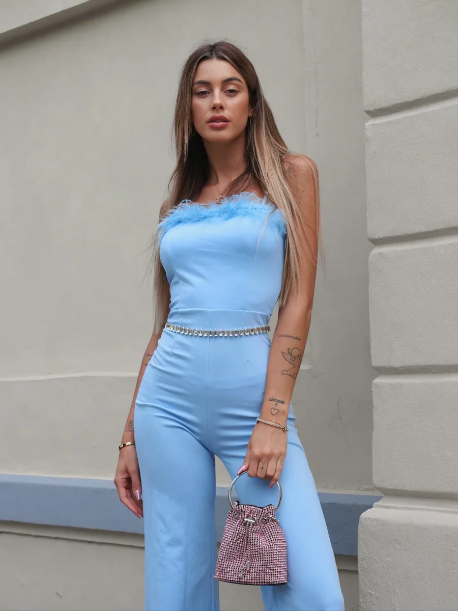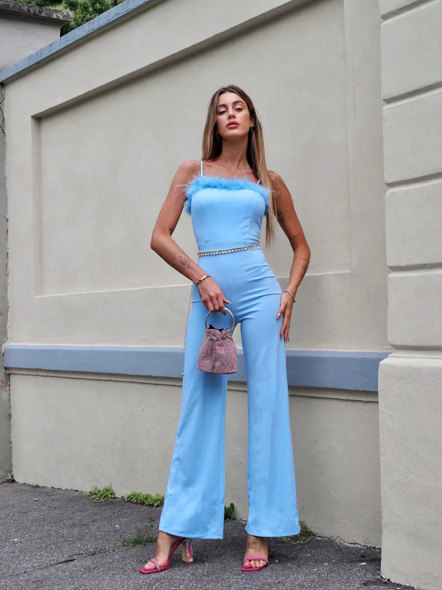 Tuta intera con spalline regolabili usabili o meno. Corpino con piume e coppe, chiusura con zip.