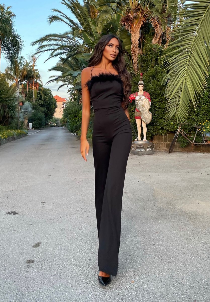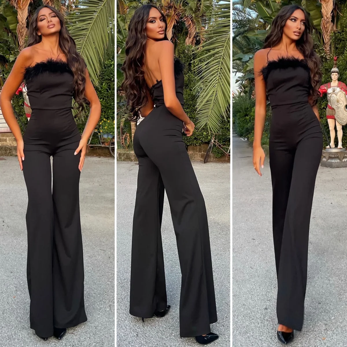 Tuta intera con spalline regolabili usabili o meno. Corpino con piume e coppe, chiusura con zip.