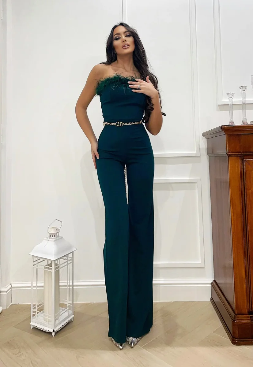 Tuta intera con spalline regolabili usabili o meno. Corpino con piume e con coppe, chiusura con zip.