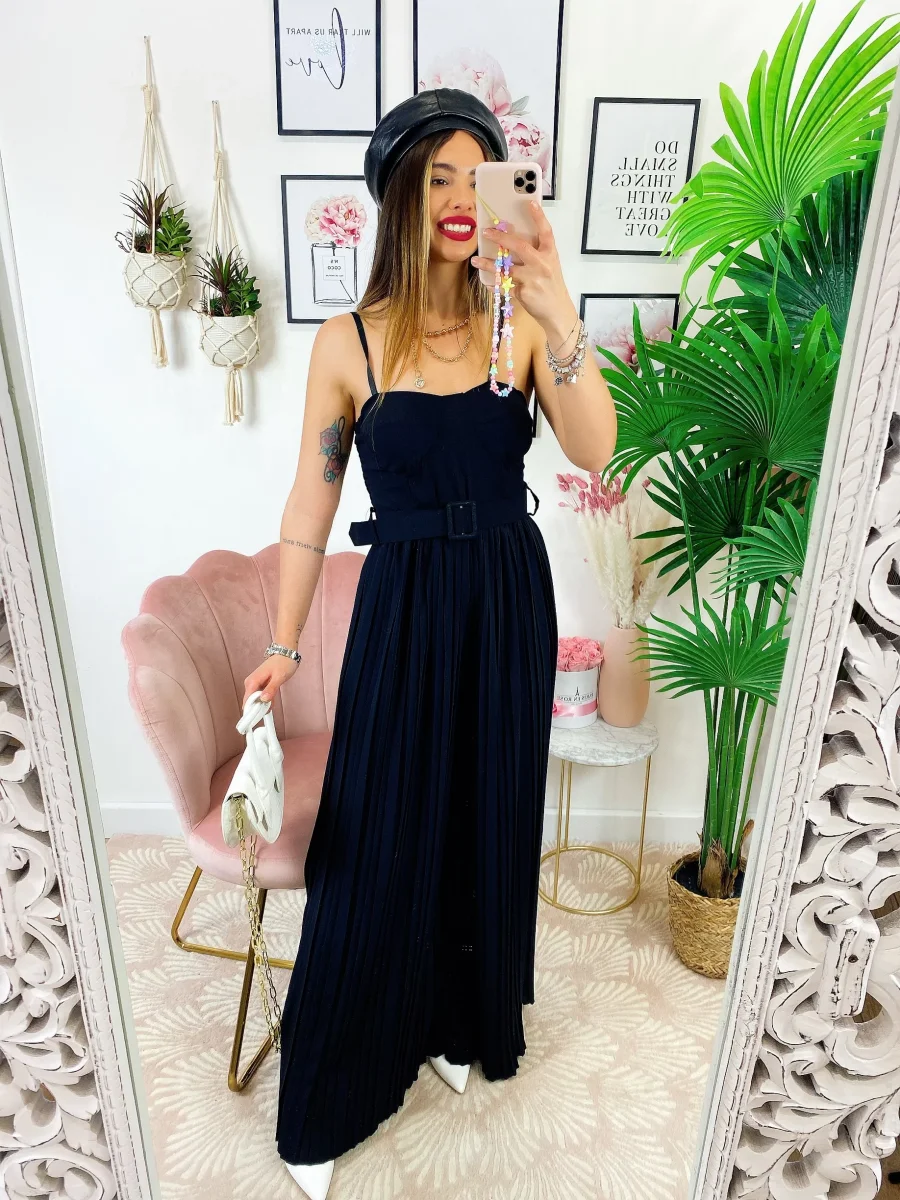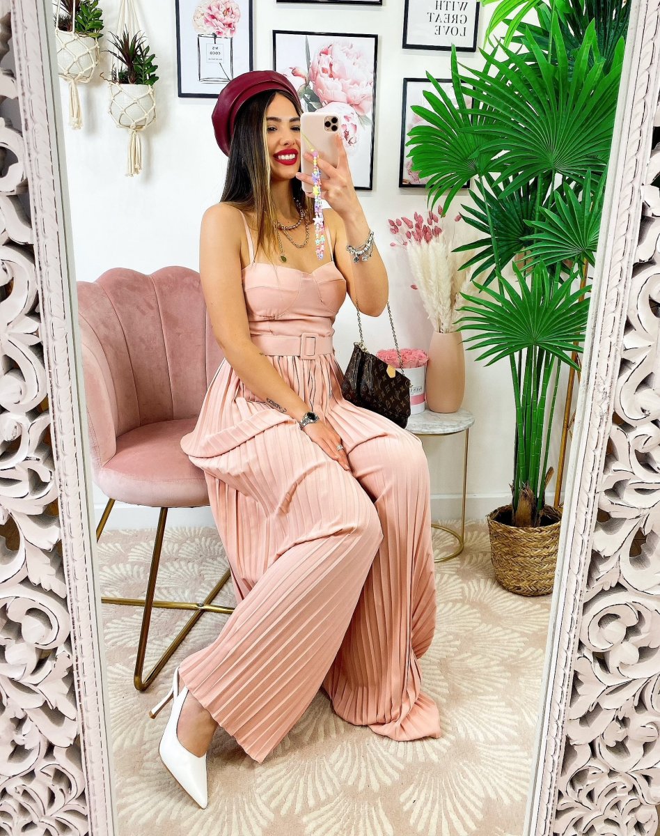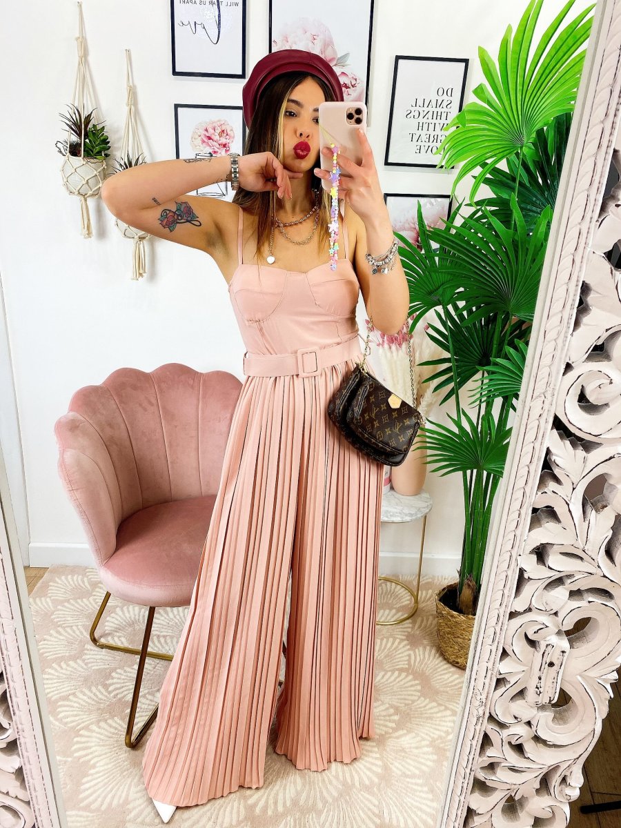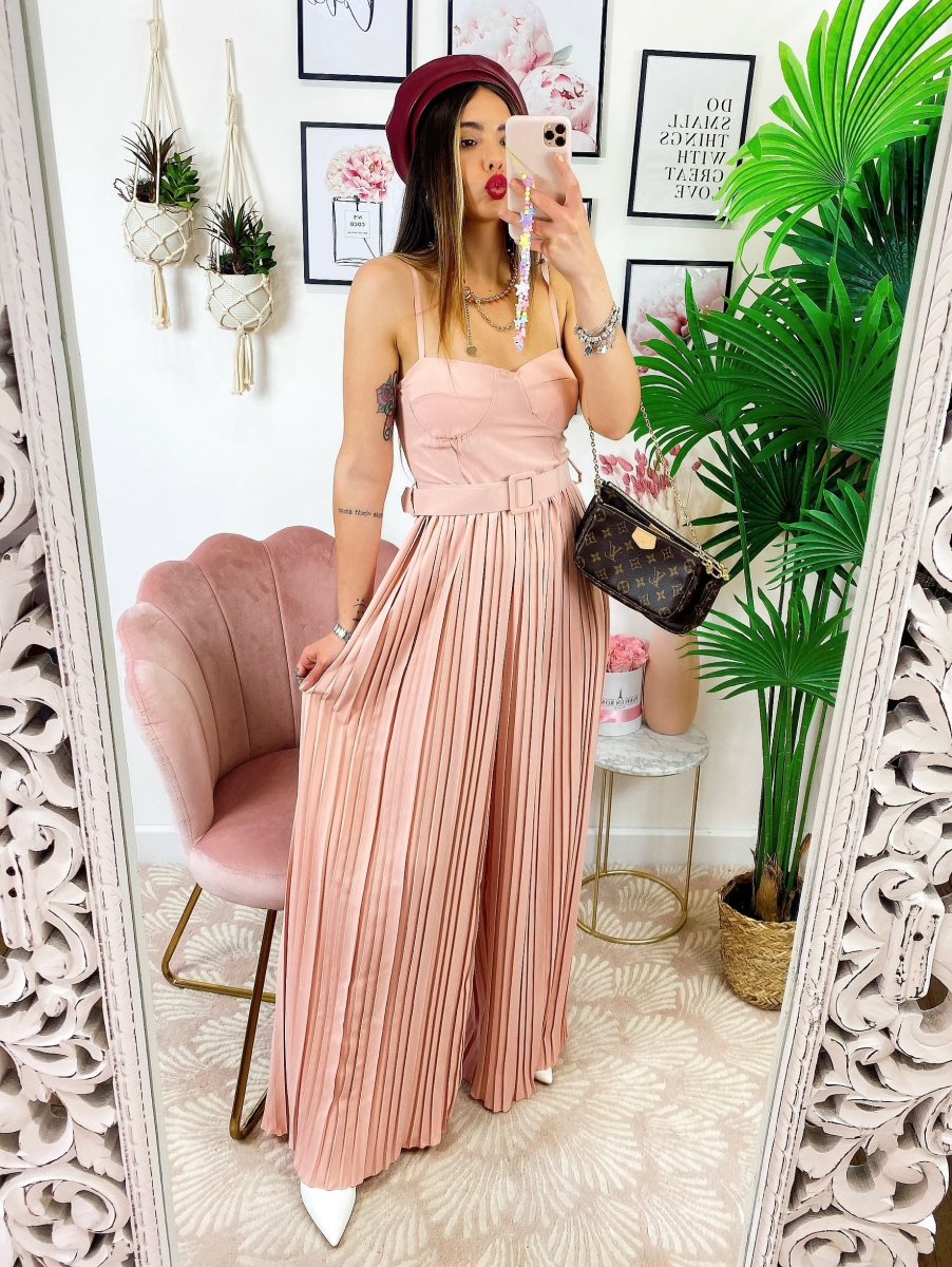 Abito da evento con pantalone a pieghine Lunga e cintura compresa, scollo a barchetta compreso di coppe.
