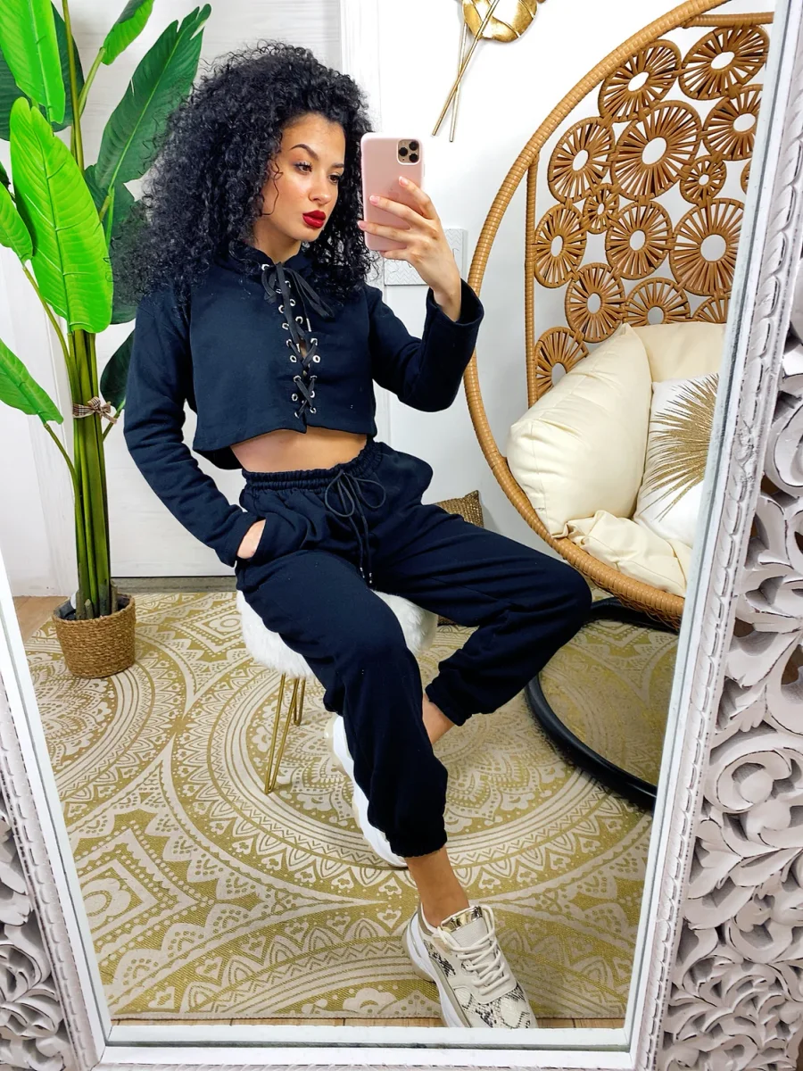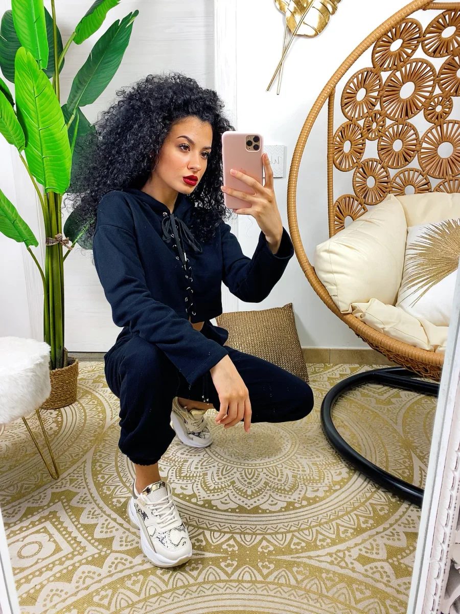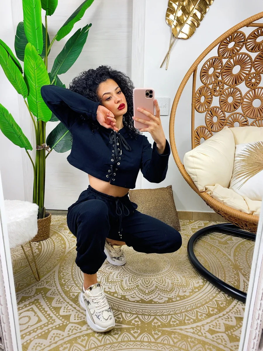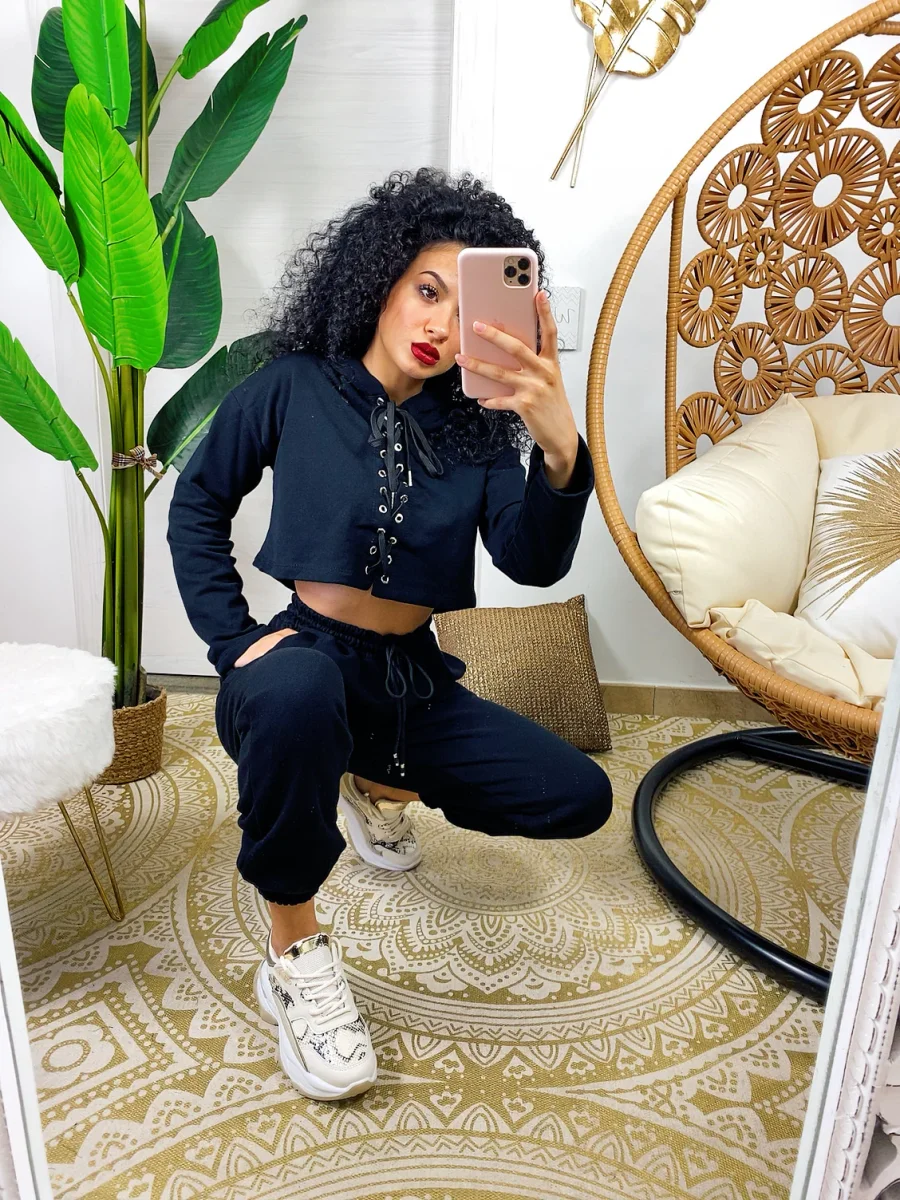 Tuta completa composta da pantalone più felpa in tessuto garzato elasticizzato.