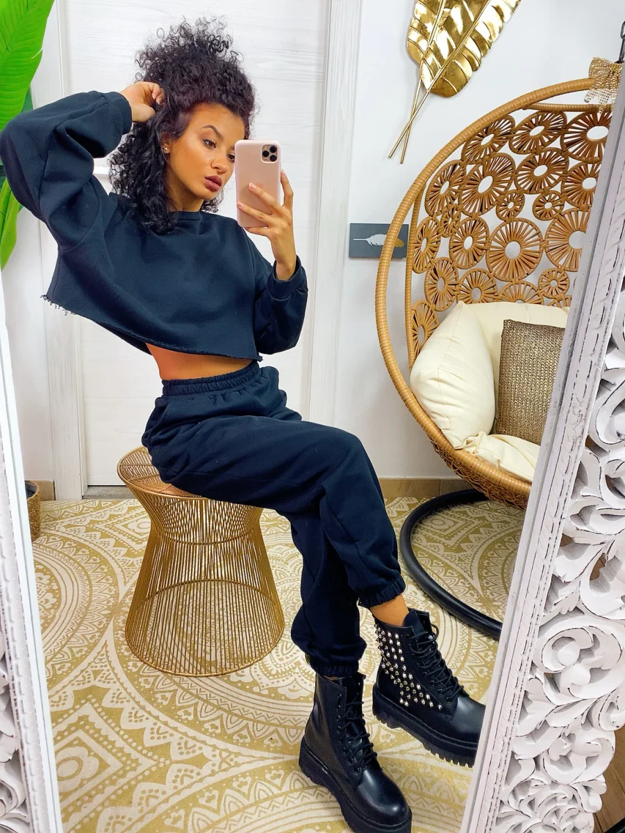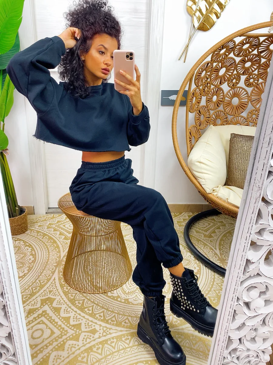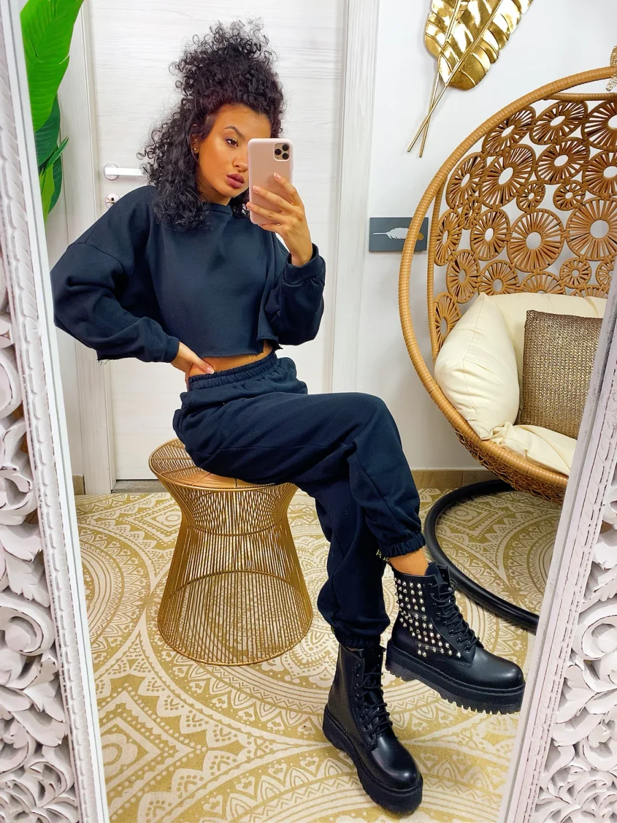 Tuta due pezzi composta da felpina e pantalone, tessuto garzato nero. Molto elasticizzata