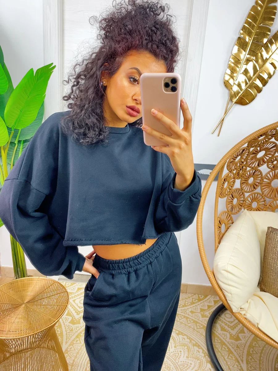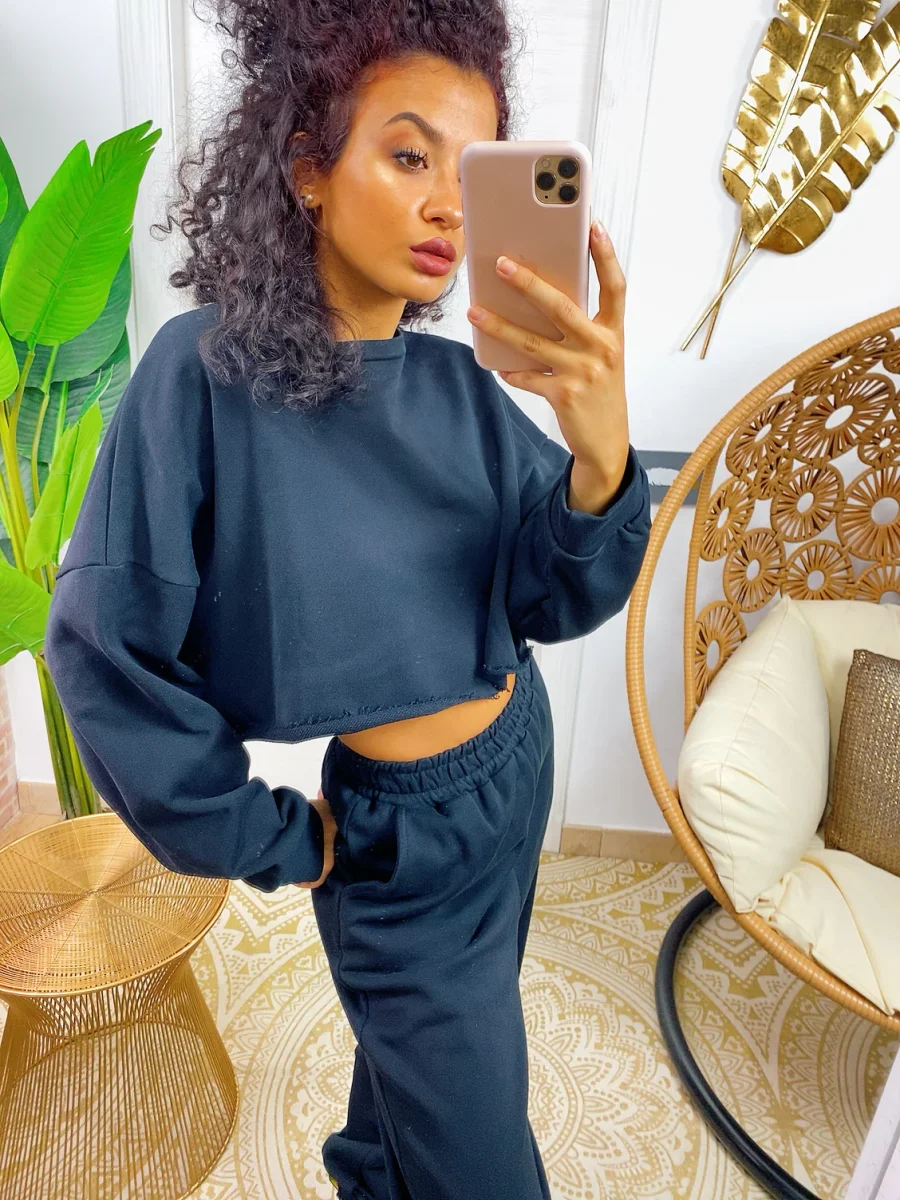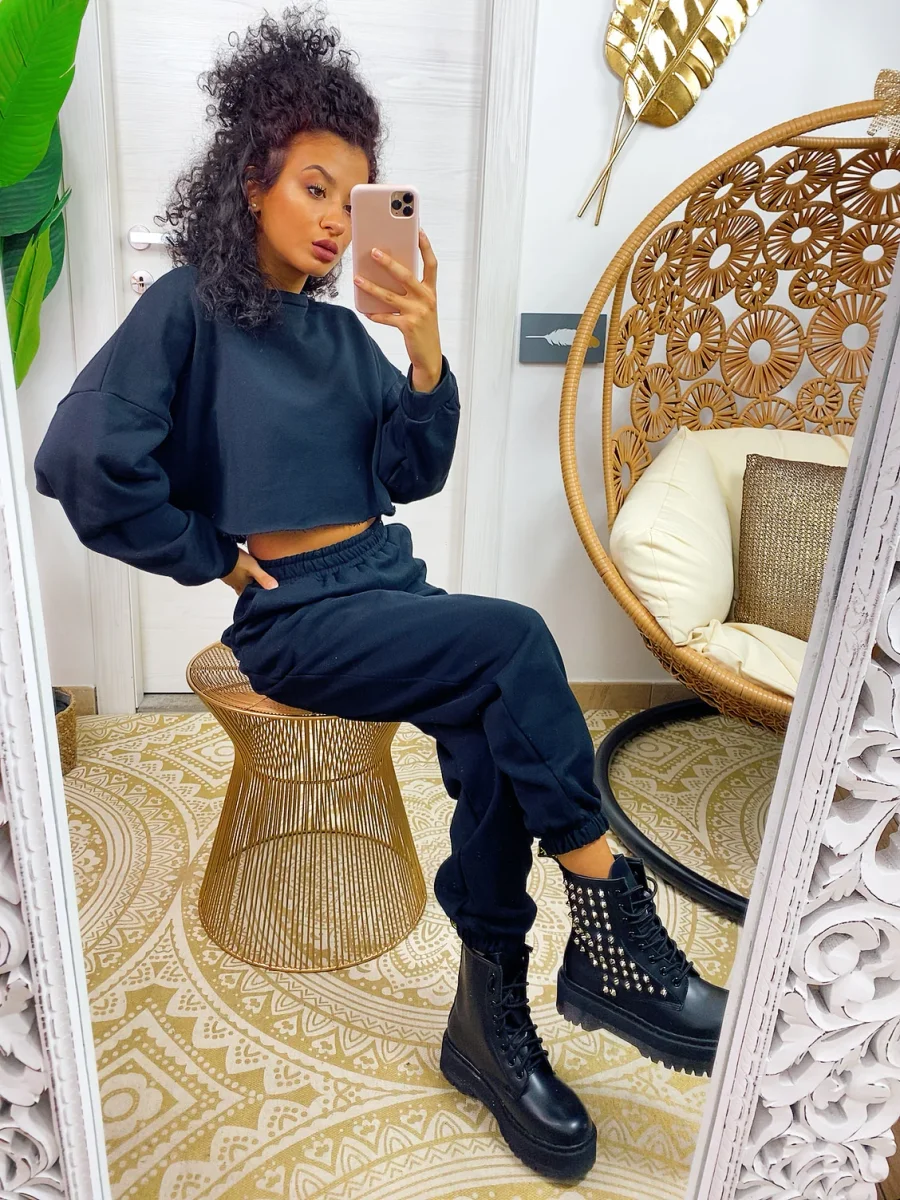 Tuta due pezzi composta da felpina e pantalone, tessuto garzato nero. Molto elasticizzata
