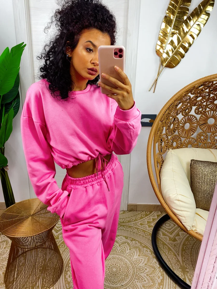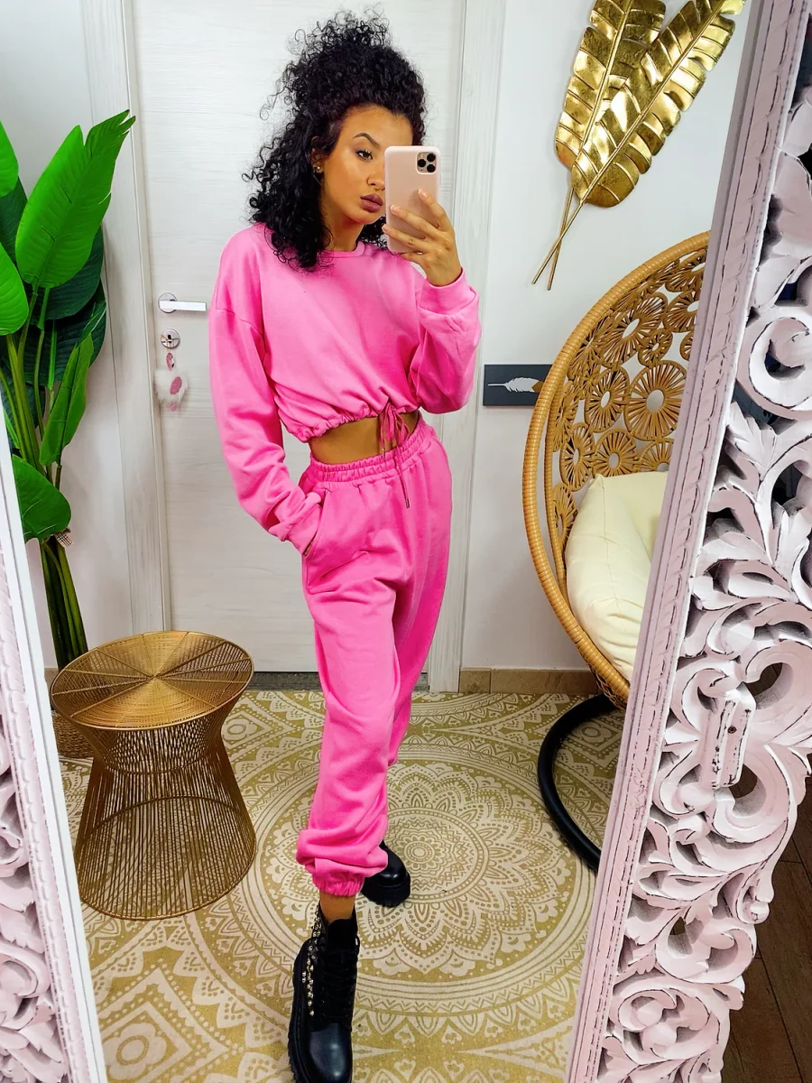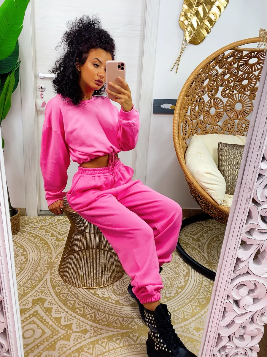 Tuta due pezzi composta da felpina e pantalone, tessuto garzato rosa. Molto elasticizzata