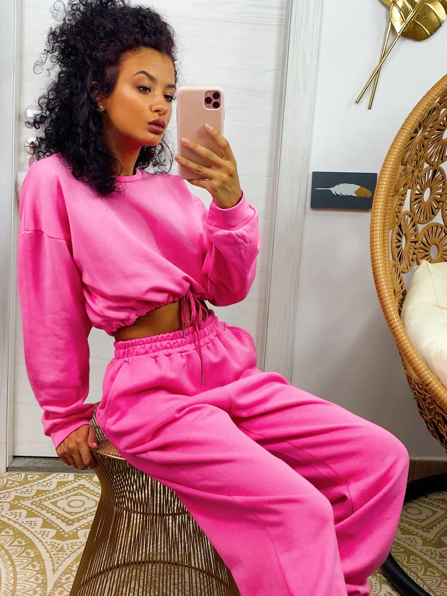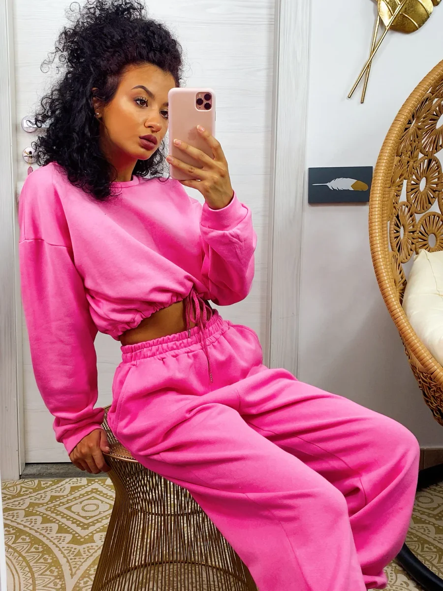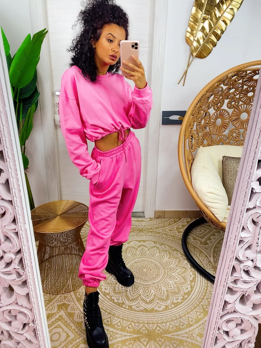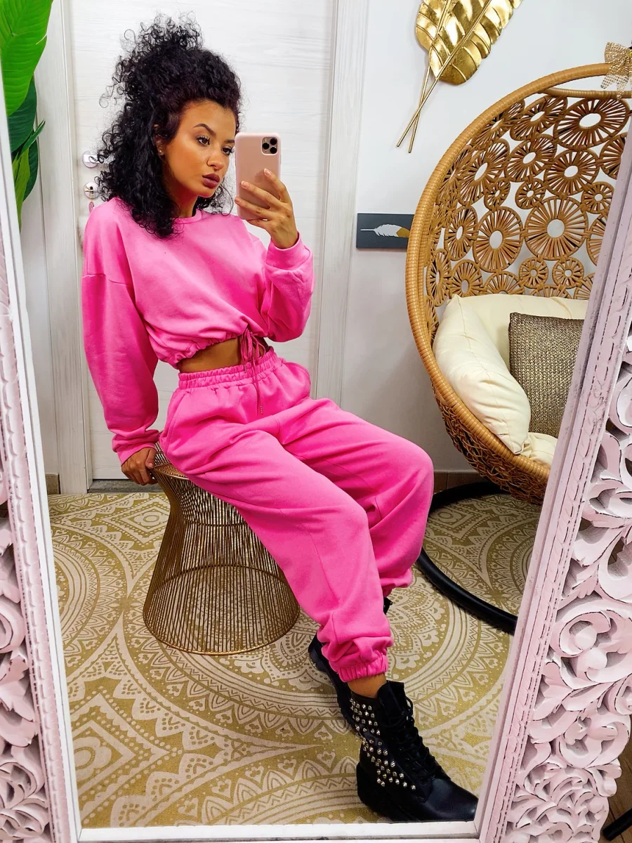 Tuta due pezzi composta da felpina e pantalone, tessuto garzato rosa. Molto elasticizzata