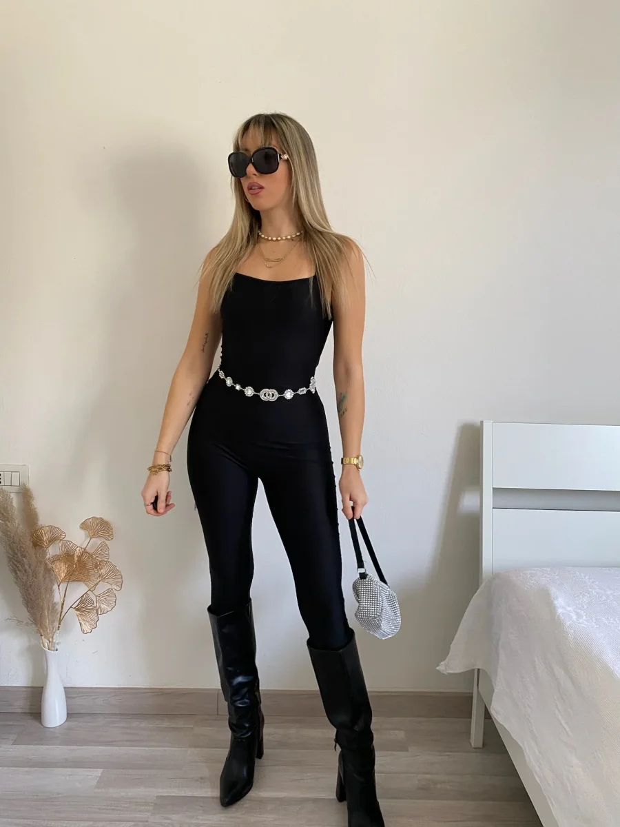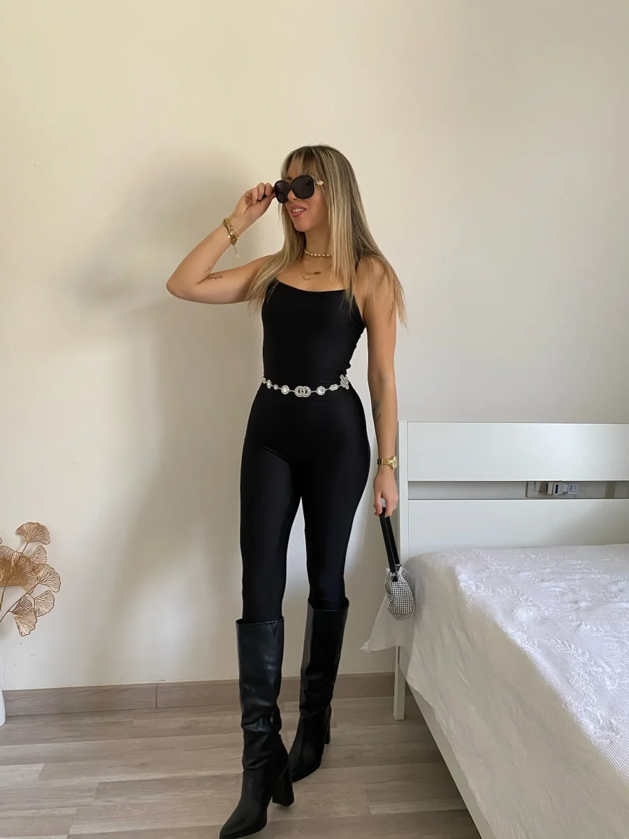 Tuta aderente in tessuto elasticizzato con bretelline sottoli .