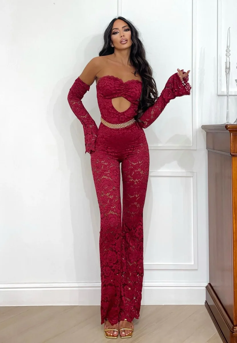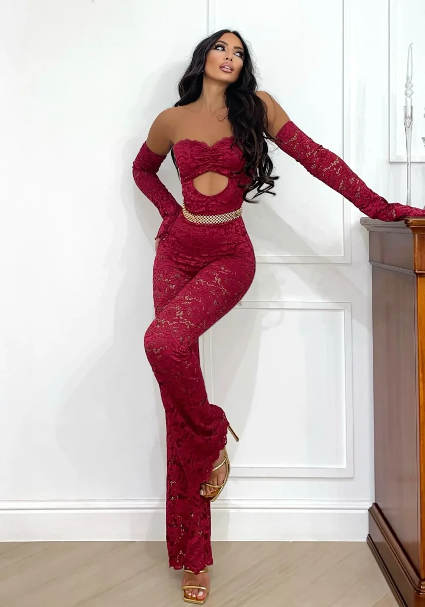 Abito in pizzo con scollo a cuore e coppe, pantalone con coulotte e guanti