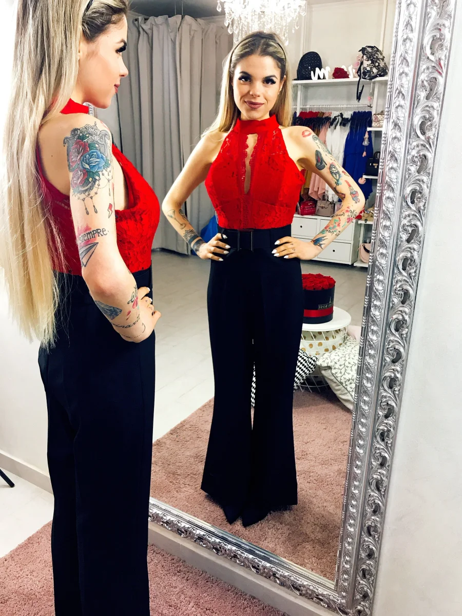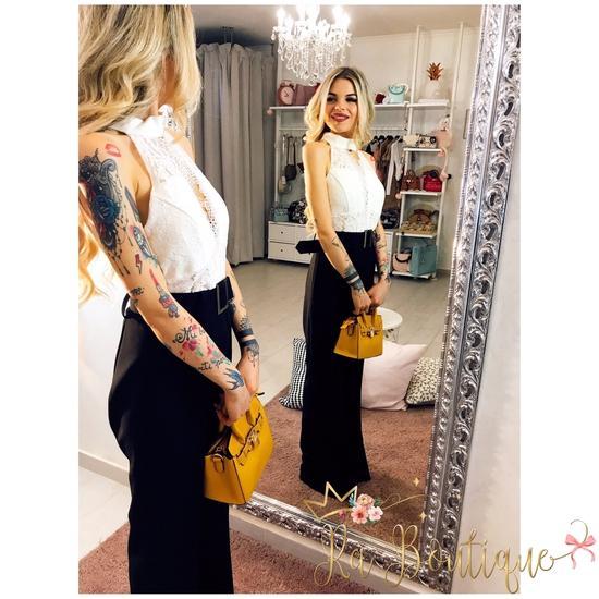 Tuta doppio colore con cintura in vita compresa . Corpino ricamato con trasparenze e chiusura al collo. Per uno stile più elegante con zampa larga da abbinare con un bel tacco.