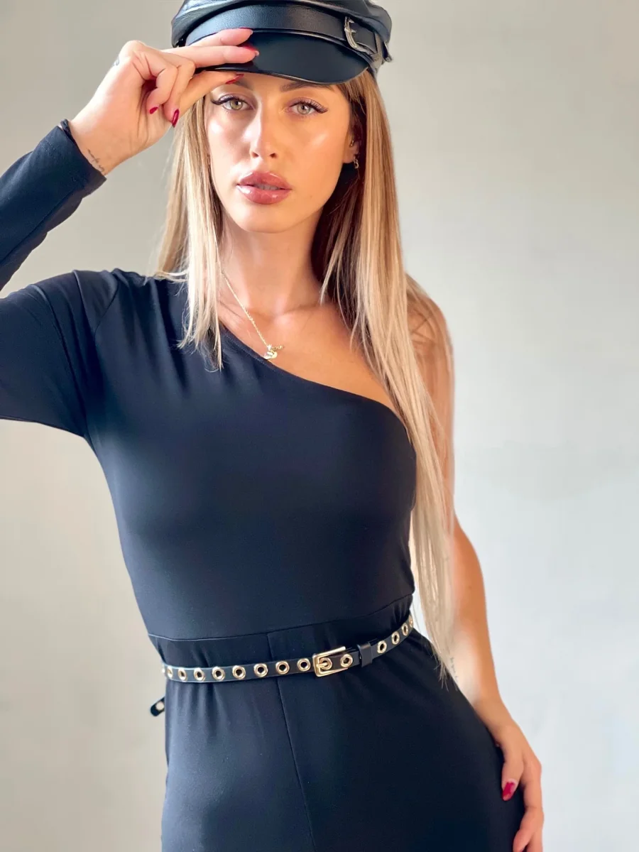 Tuta serpente monospalla super elegante. Spacco ricoperto da strass. Chiusura con zip.