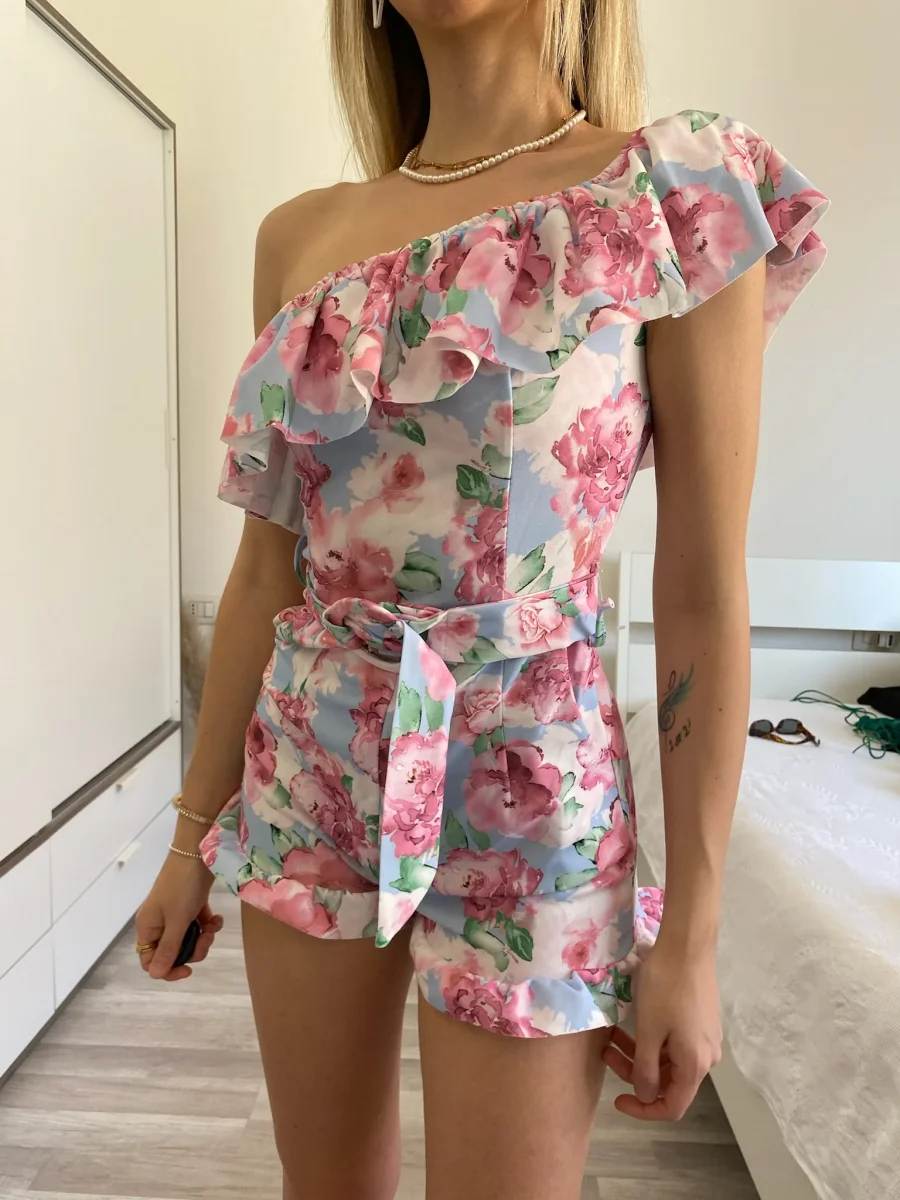 Tuta monospalla in tessuto fiorato con cintura inclusa