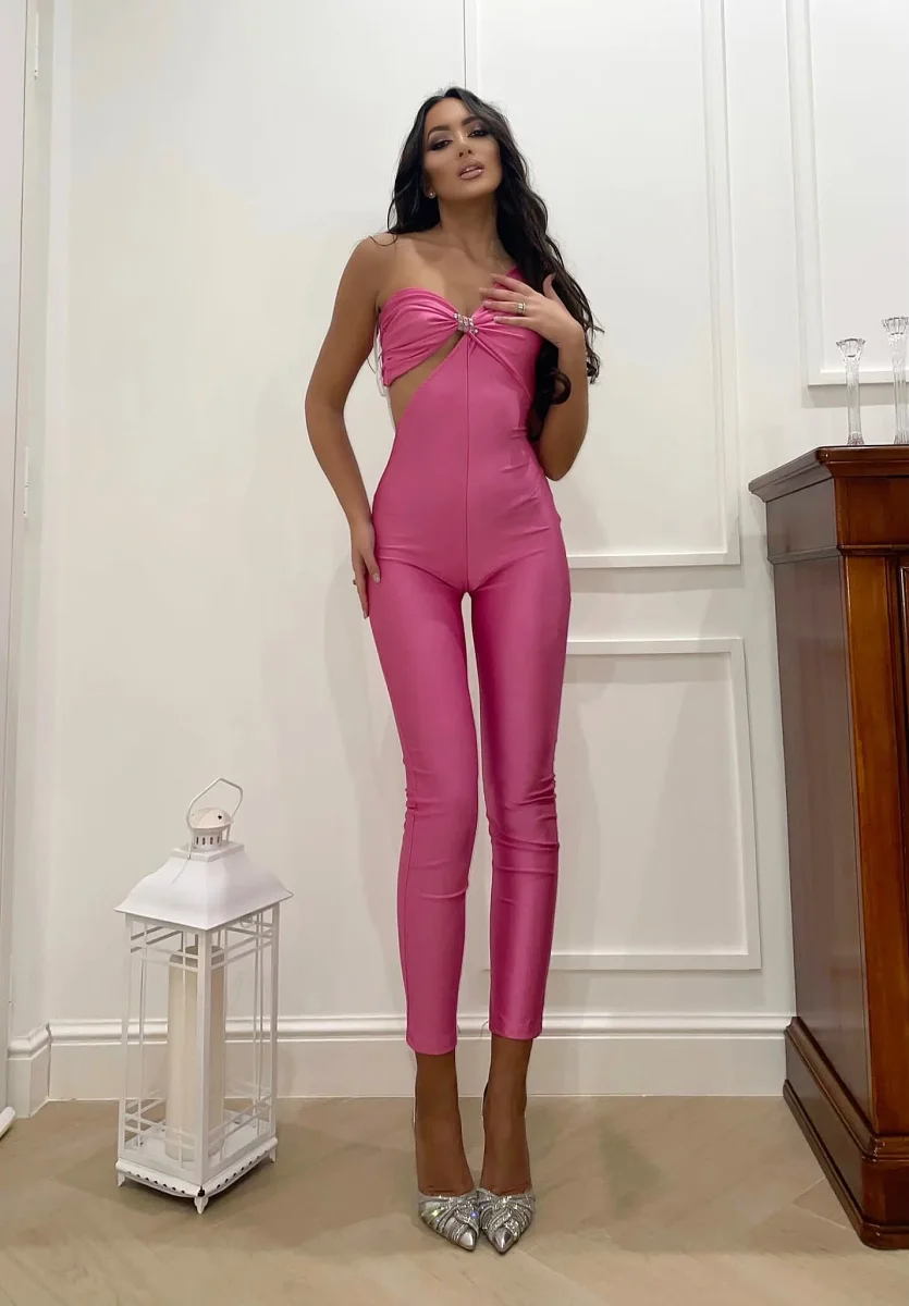 Tuta monospalla in lycra con coppe, gioiello silver sul davanti.