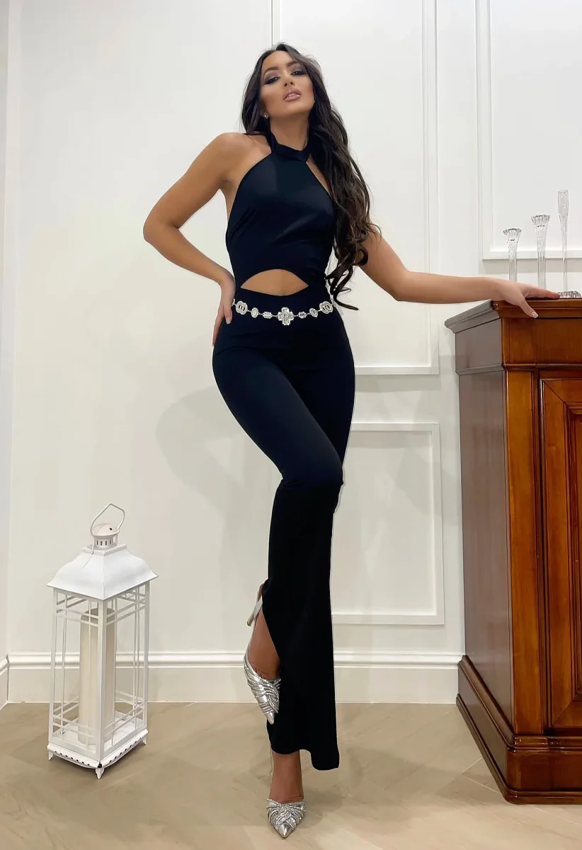 Tuta a zampa in tessuto elasticizzato, chiusura al collo e apertura sulla pancia. Schiena semi aperta e senza coppe.