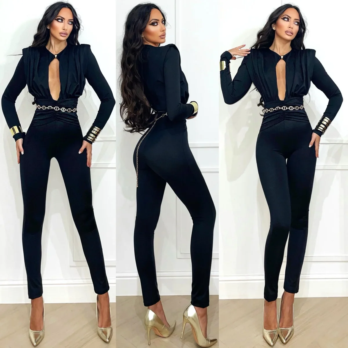Tuta in lycra con apertura sul davanti, zip nel dietro. Apertura sul davanti e dettaglio drappeggiato. Bottone a gemma oro