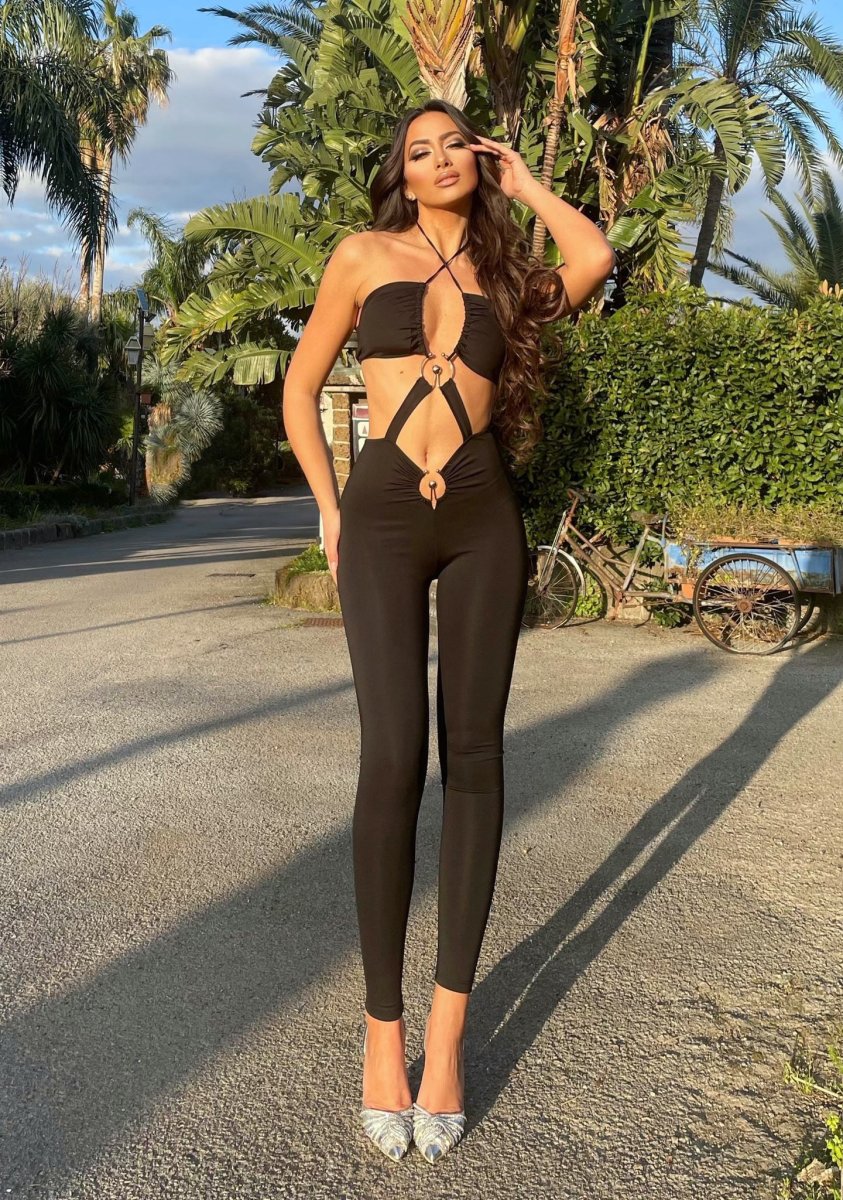 Tuta nera con incrocio e anelli oro